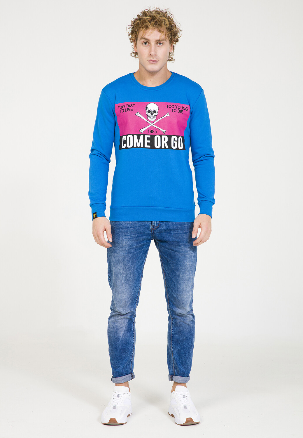 Свитер выделяется своим принтом. Манжеты в рубчик и заниженные рукава.