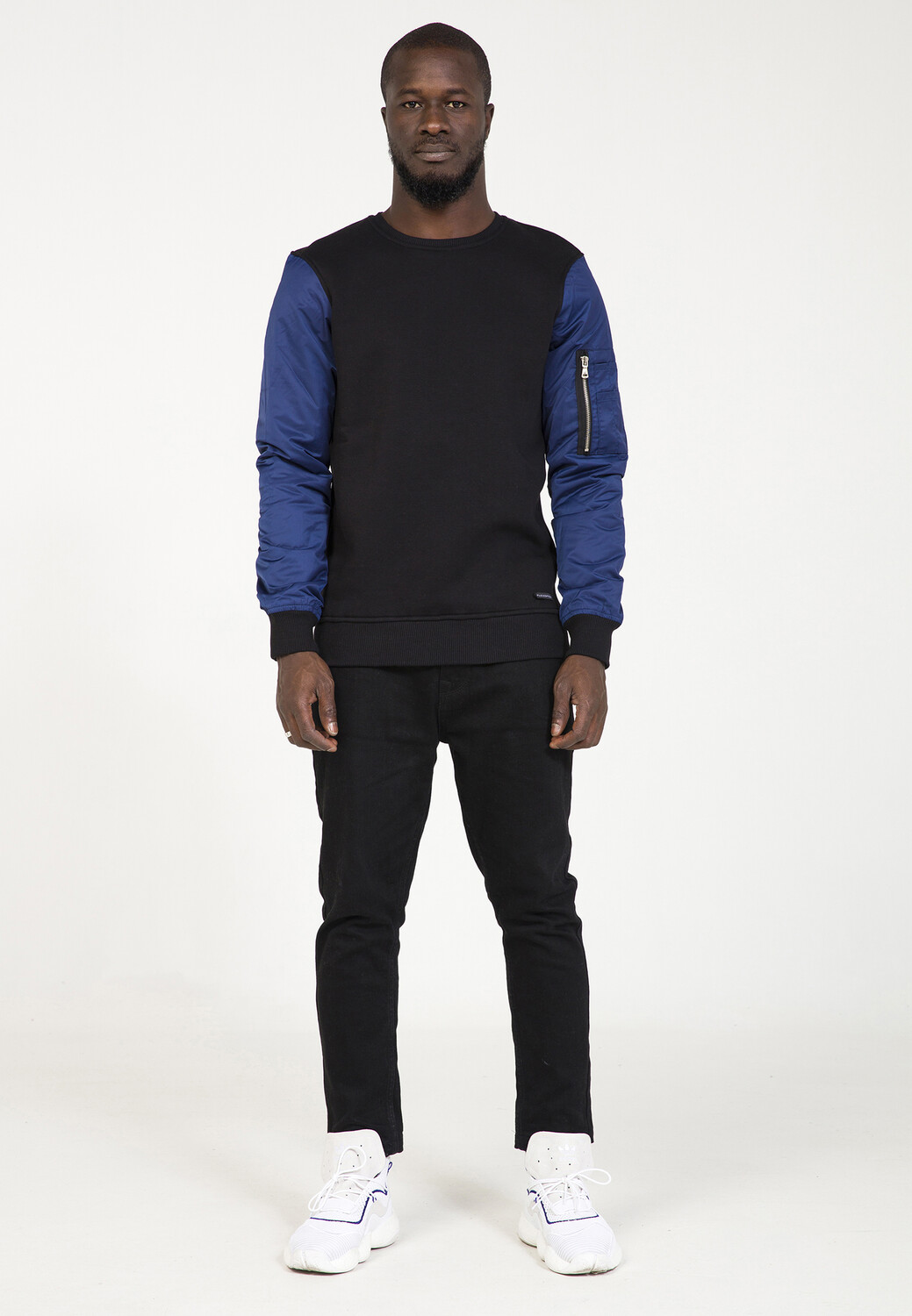 Полусвитер-полубомбер. Этот свитер круто выделяется благодаря своему смесовому составу. У него также есть ребристые манжеты и подол, а также карман на рукаве, типичный для курток-бомберов. Привлекательный внешний вид придает ему повседневный уличный стиль.
