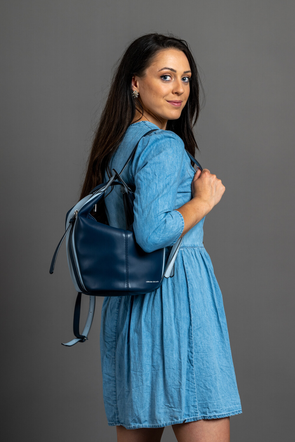 Двухцветная сумочка из веганского материала. Эту сумку через плечо можно превратить в рюкзак с меньшим количеством ручек. Настоящая изюминка!