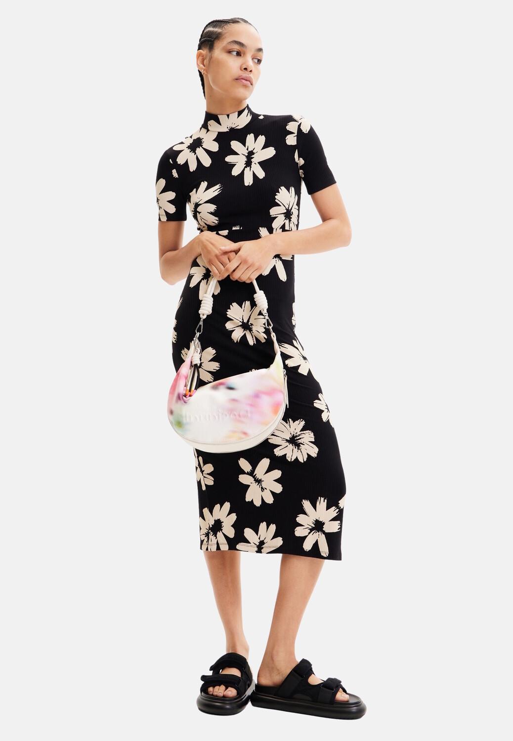 Сумка среднего размера из ткани, имитирующей кожу, женская от бренда DESIGUAL с застежкой-молнией внизу для регулировки размера, размытым рисунком, съемной подвеской с карабином и шнурами.