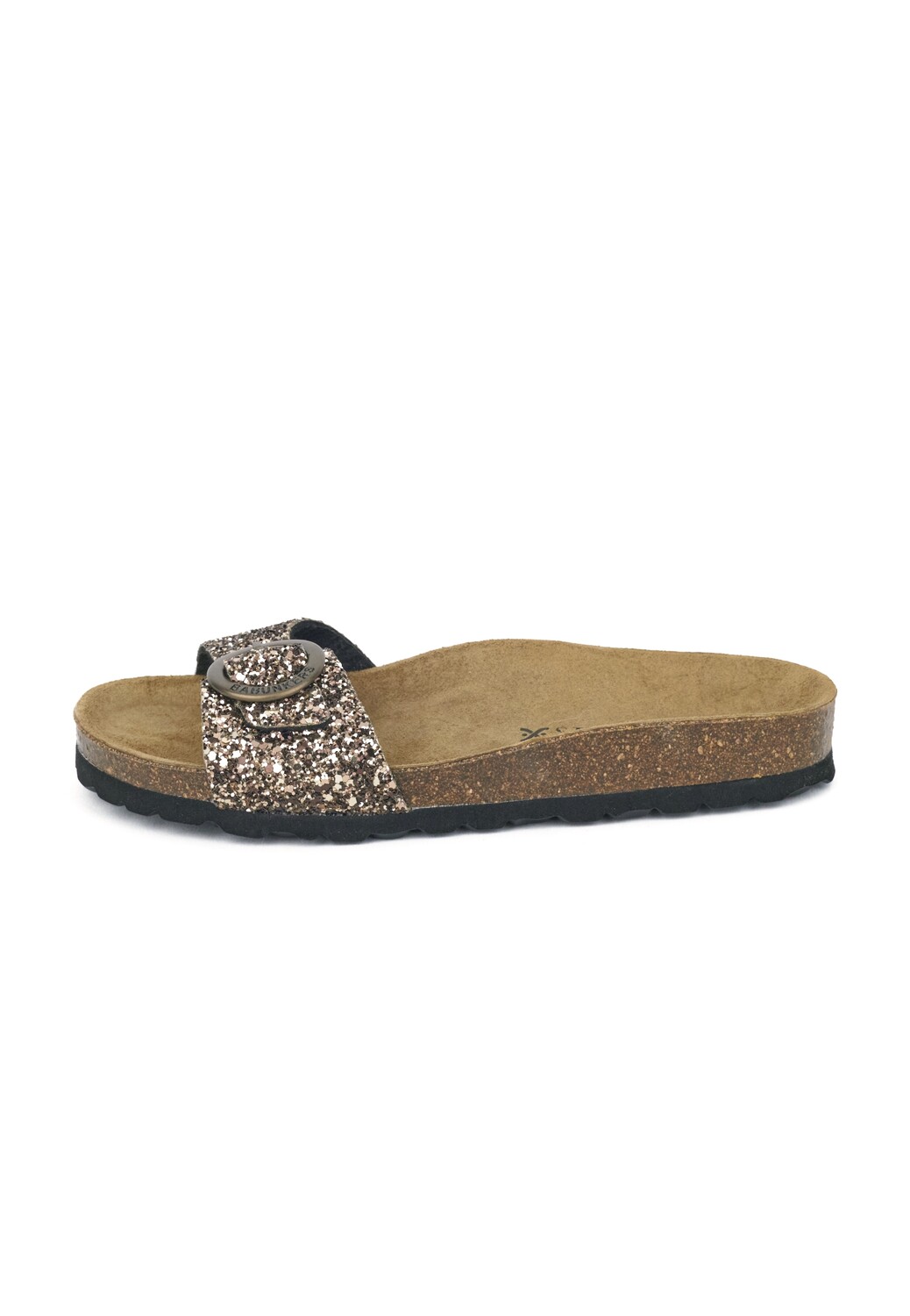 - Сандалии с блестками и ремешком, который застегивается на круглую пряжку.
