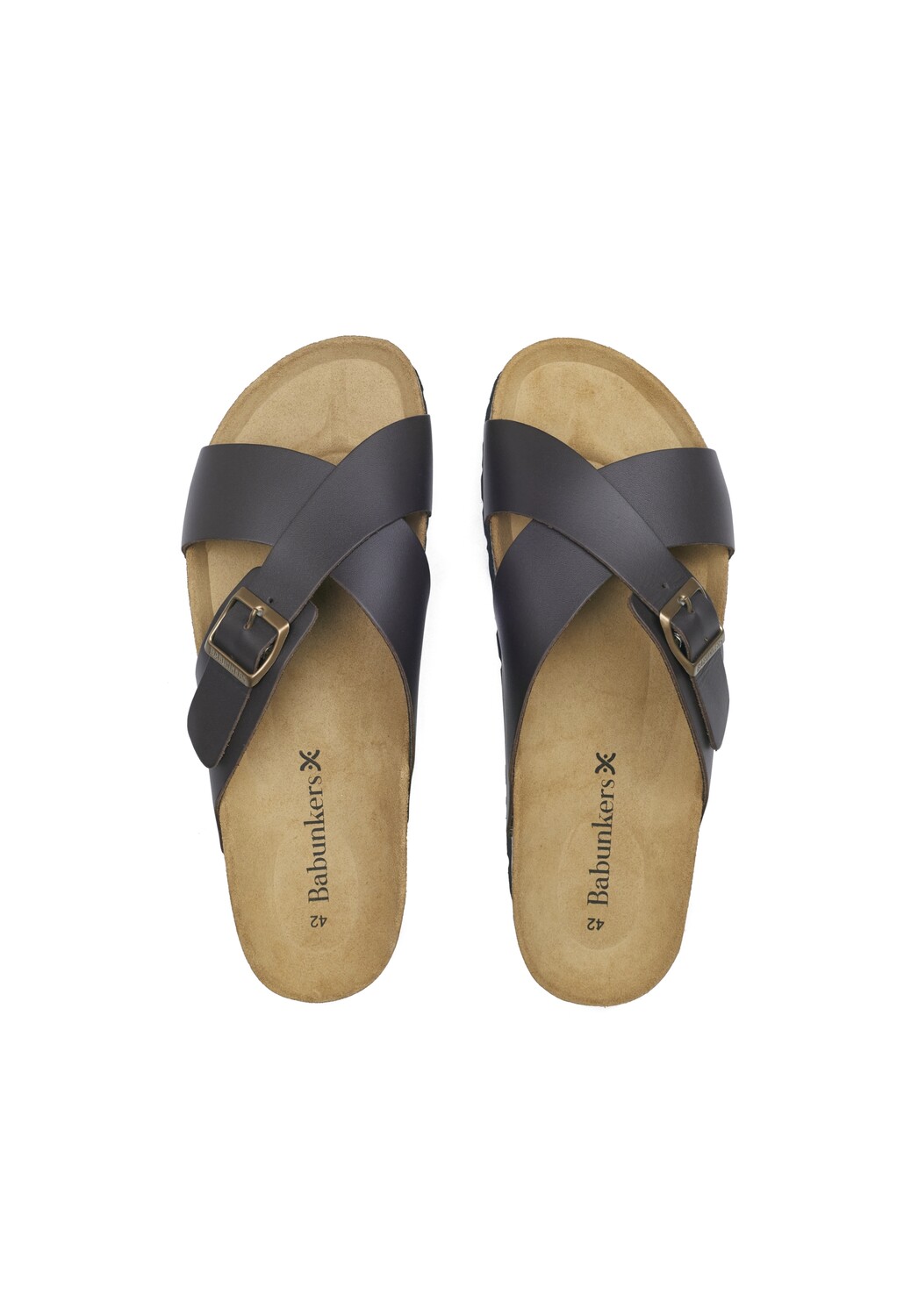 - Сандалии из кожи наппа с двумя ремешками, один из которых содержит квадратную металлическую пряжку с регулировкой.