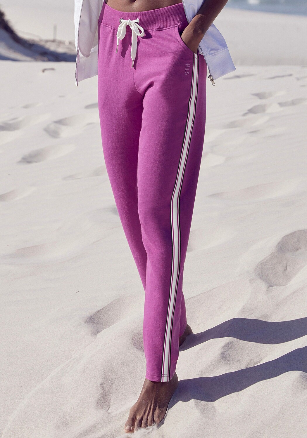 Брюки HIS для отдыха с полосатой тесьмой, эластичным поясом в рубчик с кулиской и боковыми карманами. Изготовлен из 77 % хлопка, 20 % полиэстера, 3 % эластана.
