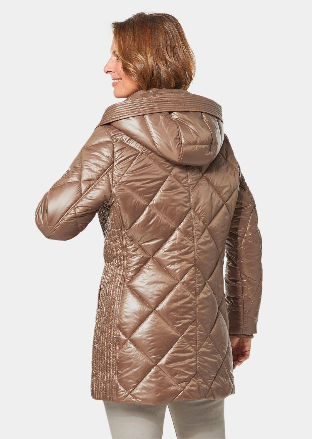 Длинная стеганая куртка для модного образа. Это обеспечивается деликатным мерцанием и ромбовидной стежкой чуть большего размера. Внутренняя подкладка с клетчатым принтом также привлекает внимание. Продольные стеганые вставки по бокам делают силуэт узким. Рукава имеют трикотажные манжеты, поэтому у холода и ветра нет шансов. Молния закрыта застежкой-кнопкой, капюшон легко застегивается и расстегивается. С двумя декоративными карманами с клапанами на молнии снаружи и карманом для мобильного телефона и внутренним карманом на подкладке. Теплая подкладка из переработанного материала. Длина около 83 см по размеру. 46, размер около 79 см. 23.