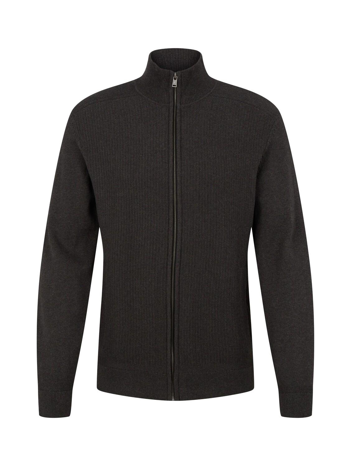 Базовый кардиган с воротником-стойкой около шеи, молнией во всю длину и боковыми карманами плотного прилегания.