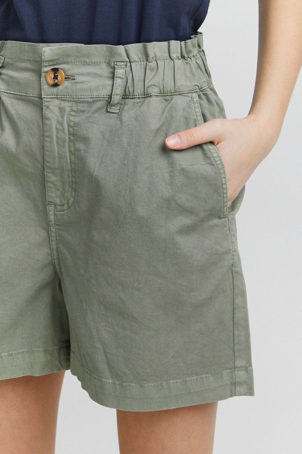 ДЕТАЛИ И ОСОБЕННОСТИ: Шорты-чиносы, стандартный крой, два боковых кармана и два ложных кармана с окантовкой сзади, пояс с петлями для ремня, высококачественный хлопок с эластичным наполнением, пояс из бумажного пакета, эластичный материал.