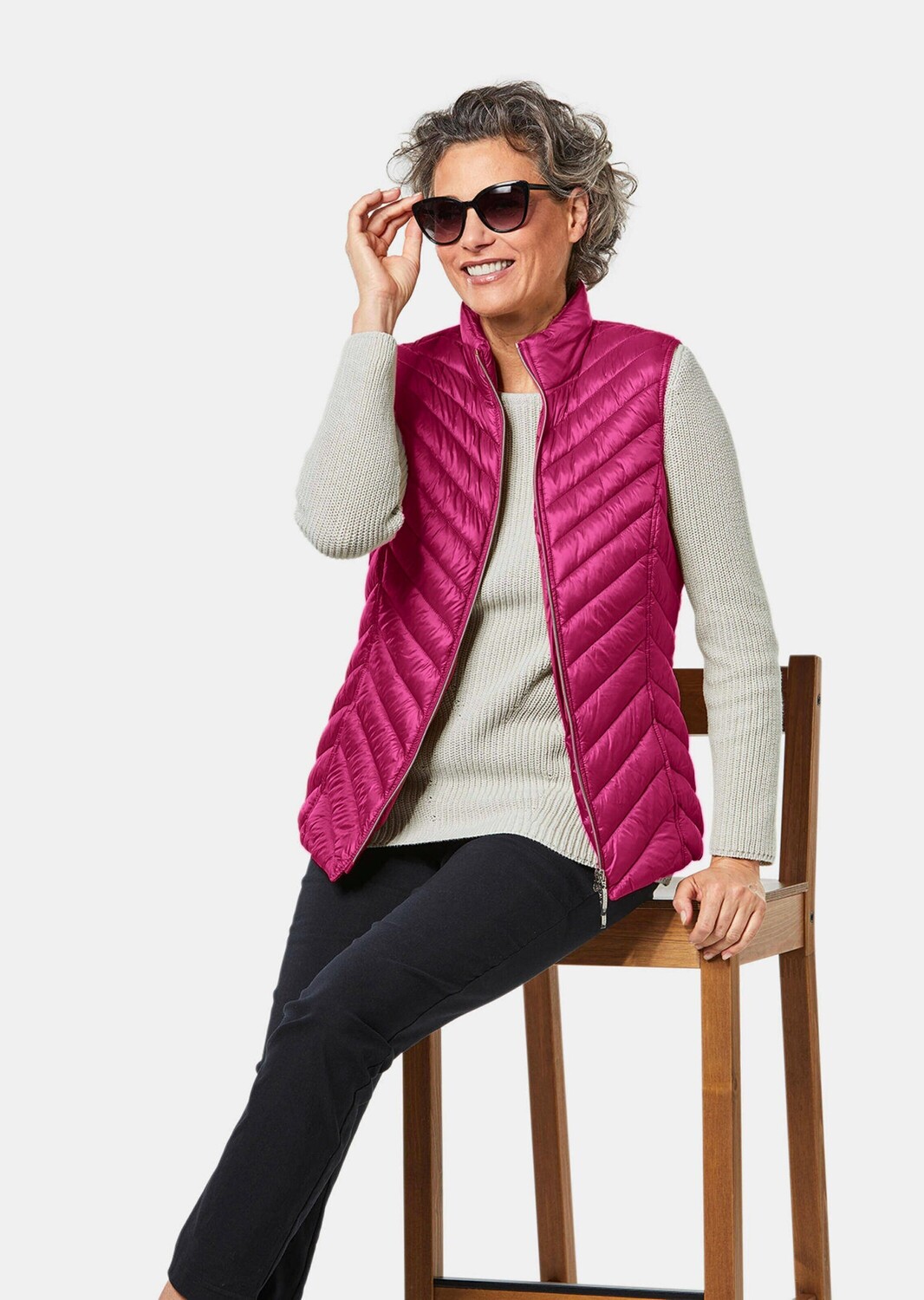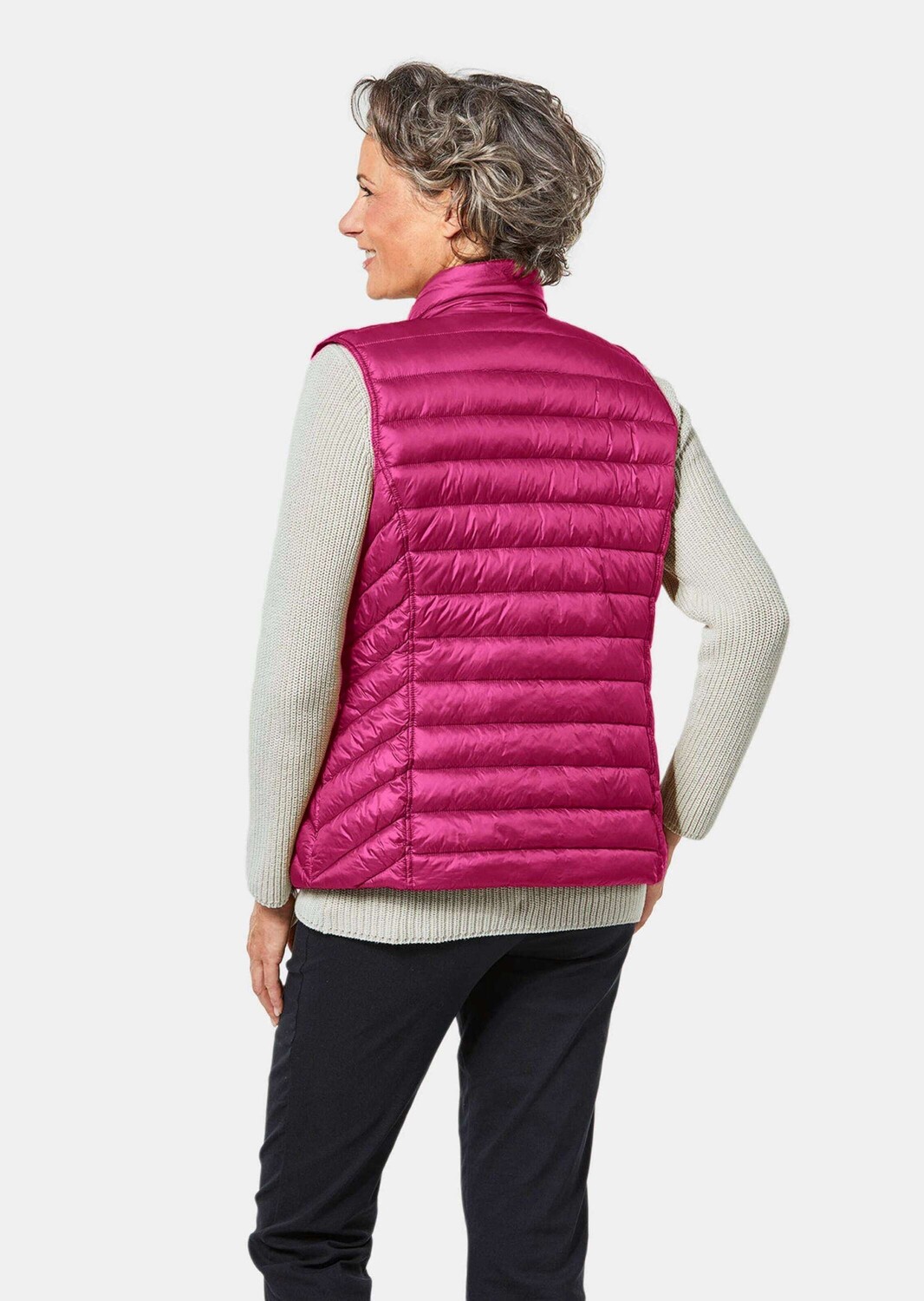 Стеганый жилет подчеркивает фигуру модной диагональной стежкой, не будучи громоздким. Сверхлегкий и устойчивый к морщинам, как настоящий пух! С двусторонней молнией, венским швом и боковыми карманами. Длина около 66 см по размеру. 46, размер около 62 см. 23.