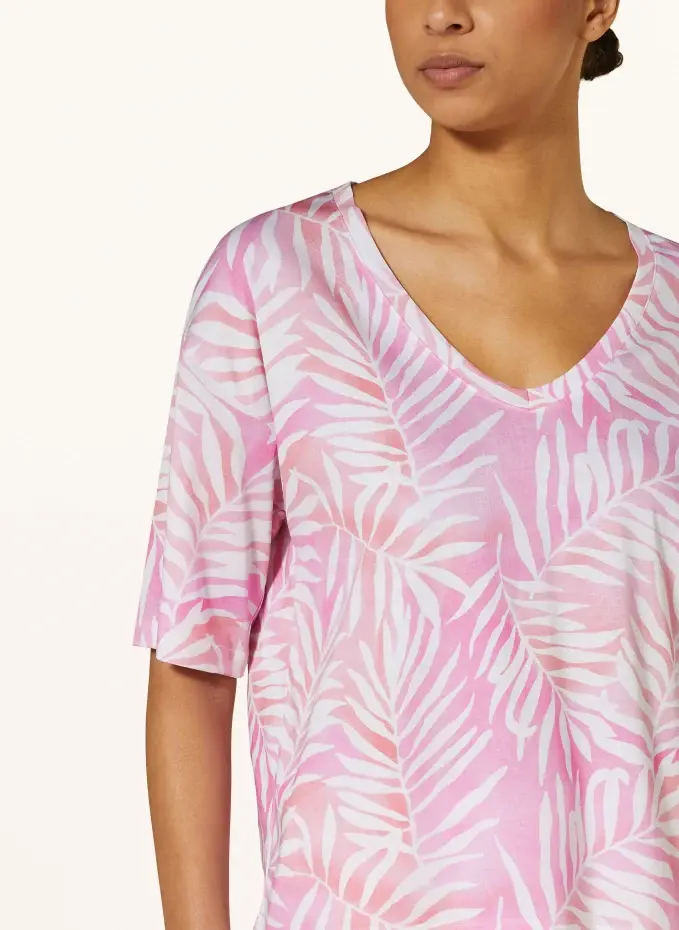Прямого покроя. V-образный вырез. Короткие рукава. Перерез плеч. Сплошной принт. Качество Джерси