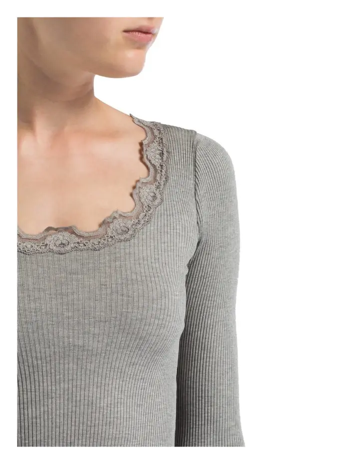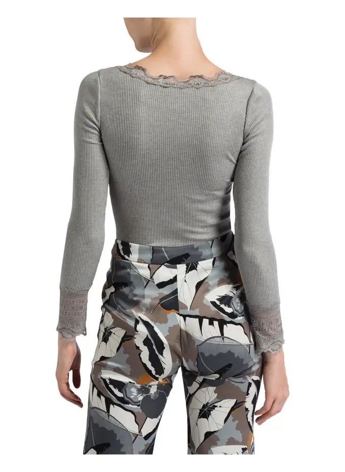 Индивидуальный крой. Круглый вырез горловины украшен кружевной отделкой. Рукав заканчивается кружевной отделкой. Подвернутый подол. Ребристый дизайн. Шелково-хлопковая композиция