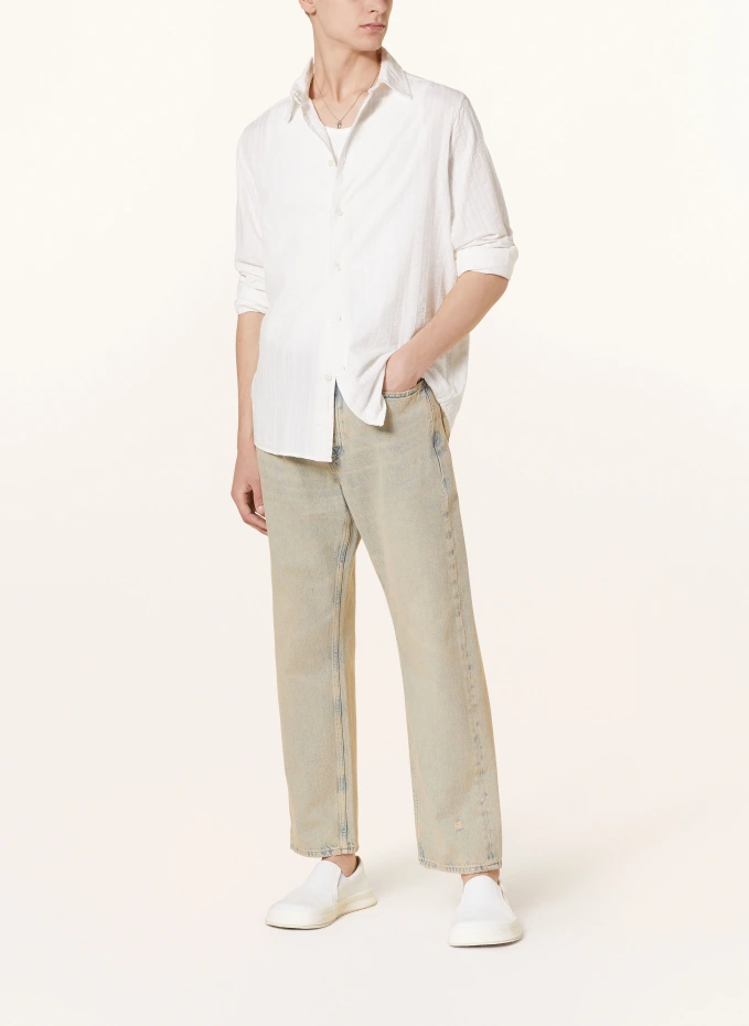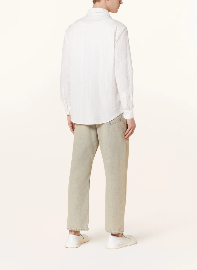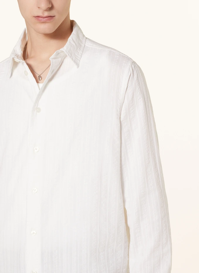 Посадка по данным производителя: Свободная посадка. Две складки на спине. Кентский воротник. Широкая кокетка сзади. Гладкая планка с пуговицами. Полосатая ткань из жатого хлопка по всей поверхности. Чистый хлопок. Структурированное ощущение