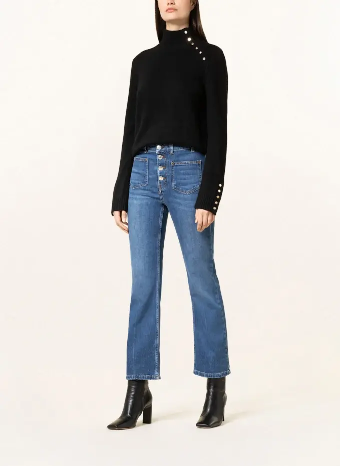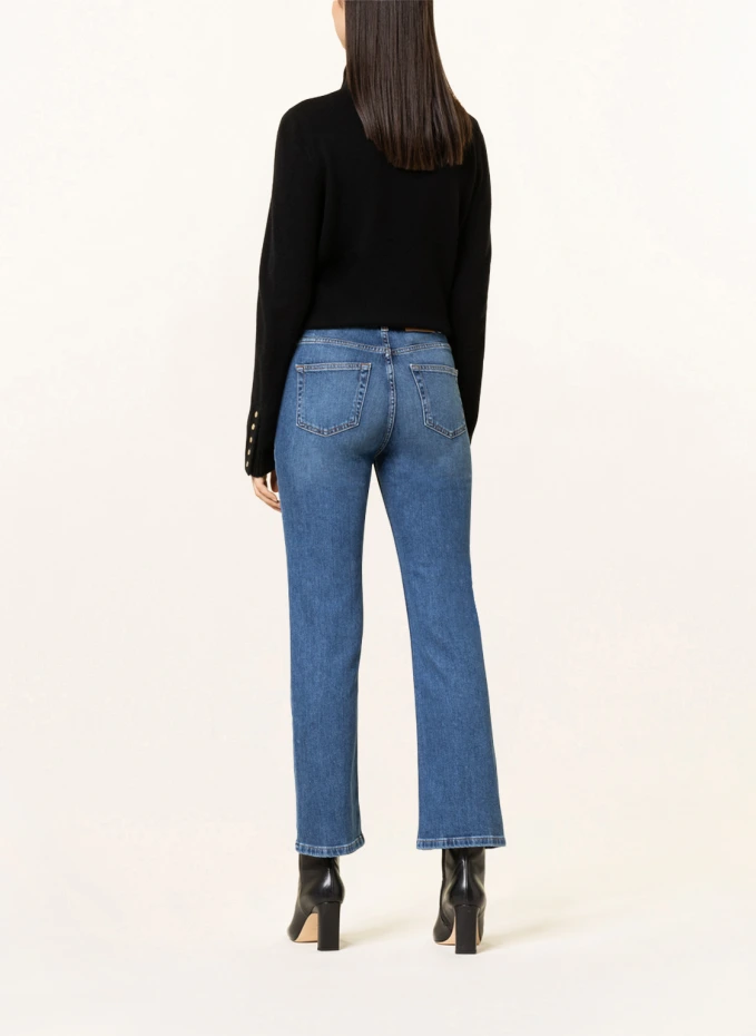 Высокая талия. Прямая нога. Застежка на пуговицы. Модель с 4 карманами. Этикетка на поясе. Визуально сиденье складывается. Эластичный хлопок