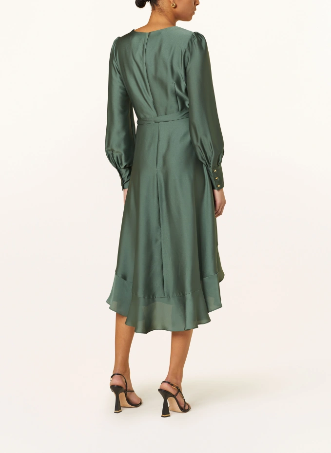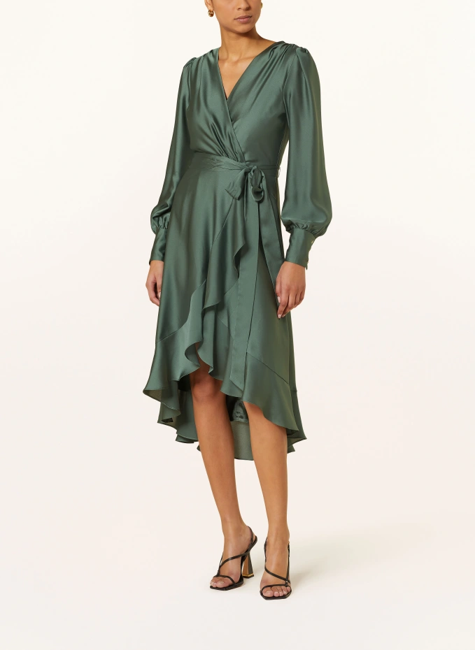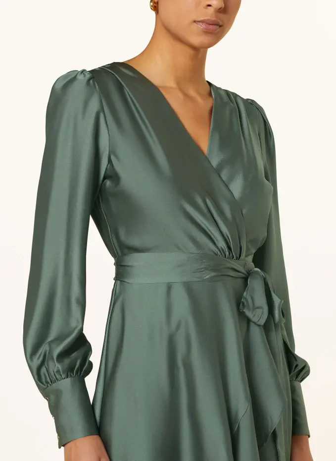 Индивидуальный крой. V-образный вырез с запахом. Сборка на уровне плеч. Застегивается на тонкую молнию по центру спинки. Манжета на трёх пуговицах. Съемный пояс на талии. Юбочная часть с воланами. Обработка на подкладке. Мерцающее качество. Гладкое ощущение