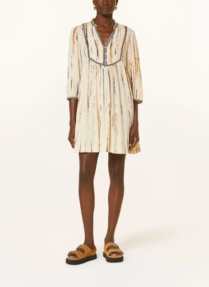 Прямого покроя. Вырез туники. Закрывается на короткую планку на пуговицах. Рукава 3/4. Собирается спереди и сзади. Разрез по центру спинки. Безлинейная обработка. Сплошной узор. Легкое ощущение