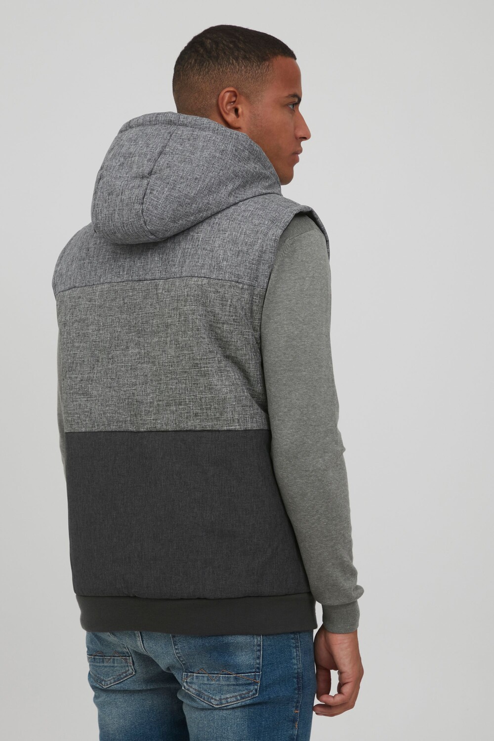 ДЕТАЛИ И ОСОБЕННОСТИ: Жилет с меланжевым эффектом, внутренняя подкладка и высокий уровень комфорта, капюшон с регулируемым шнурком и высоким запирающимся воротником, аппликации из искусственной кожи на левой груди, молнии и шнурок, два боковых кармана (на молнии), один внутренний. карман, эластичный пояс и манжеты в рубчик.