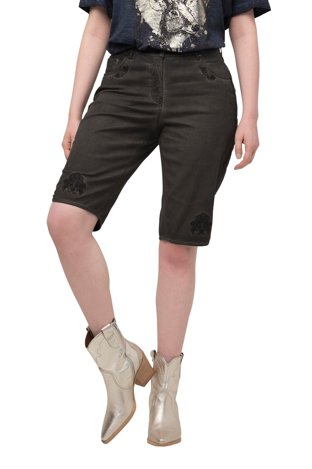 Мэнди традиционные джинсовые бермуды. Современный традиционный стиль костюма в молодежном стиле. По крою они напоминают классические традиционные кожаные брюки, поэтому их можно комбинировать по-разному. Высокий комфорт при ношении благодаря эластичному материалу. Привлекает внимание: традиционная цветочная вышивка на передних карманах и коленях. Бермуды с 5 карманами, удобным поясом и петлями для ремня. Застежка на пуговицу и молнию. Короткие разрезы по низу.