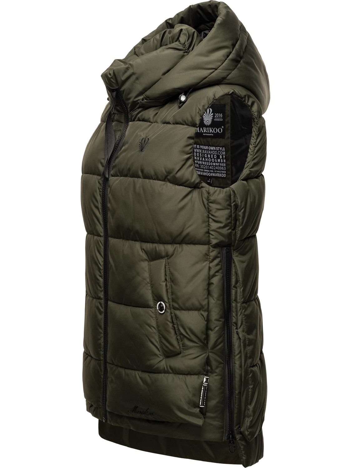 ВИД: Модный женский стеганый жилет без рукавов со сложными деталями и съемным капюшоном от Marikoo — идеально подходит для холодного сезона (осень и зима). МАТЕРИАЛ: Теплый уличный жилет из супермягкого водоотталкивающего наружного материала, с мягкой набивкой и очень удобный в носке.