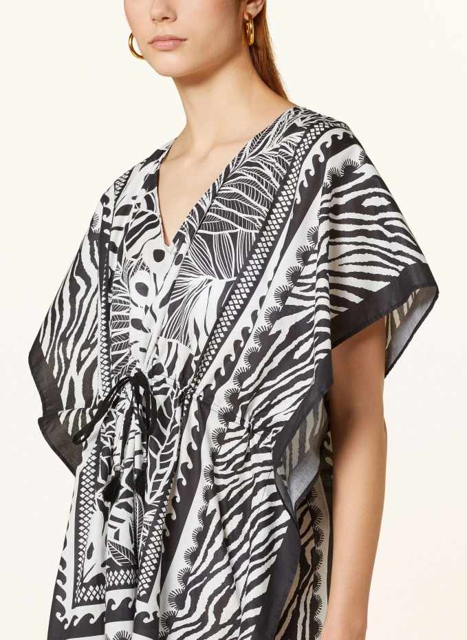 Прямого покроя. V-образный вырез. Шнурок на уровне талии. Боковые разрезы. Сплошной принт. Кисточки на подоле. Изготовлен из органического хлопка.