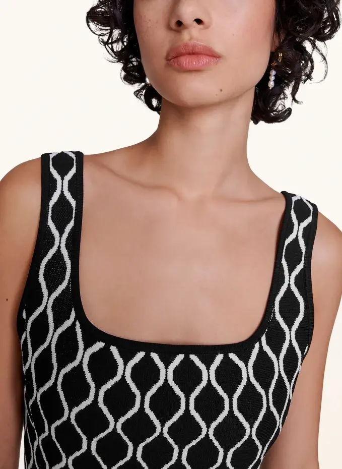 Жаккардовый трикотаж. Индивидуальный крой с расклешенной юбкой. Квадратный вырез. Широкие бретели. Безлинейная обработка. Графический узор по всей поверхности. Эластичная обработка