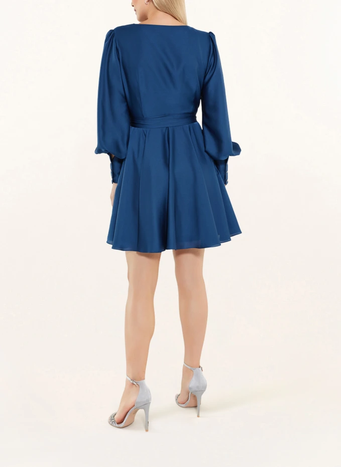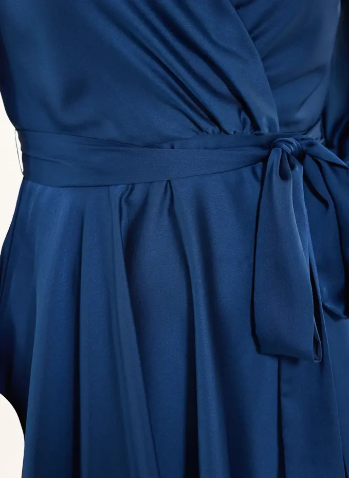Индивидуальный крой с расклешенной юбкой. Раздел Cache-Cœur. Длинный рукав. Манжета на трёх пуговицах. Со съемным поясом и петлями для ремня. Застегивается на тонкую молнию сбоку. Обработка на подкладке. Блестящая оптика. Ощущение гладкости и плавности. Качество атласного шифона