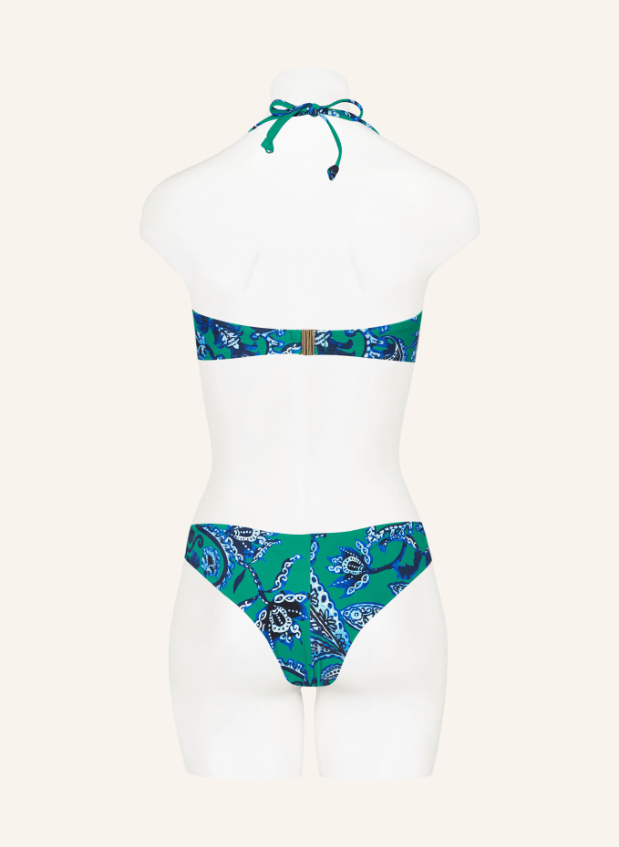 Мягкие чашки. С глажкой. С фигурной окантовкой по бокам. Съемные бретели. Завязываться на шее. Закрытие клипсой. Сплошной узор. Боковые рюши. Обернуть дизайн. Изготовлено из переработанных материалов