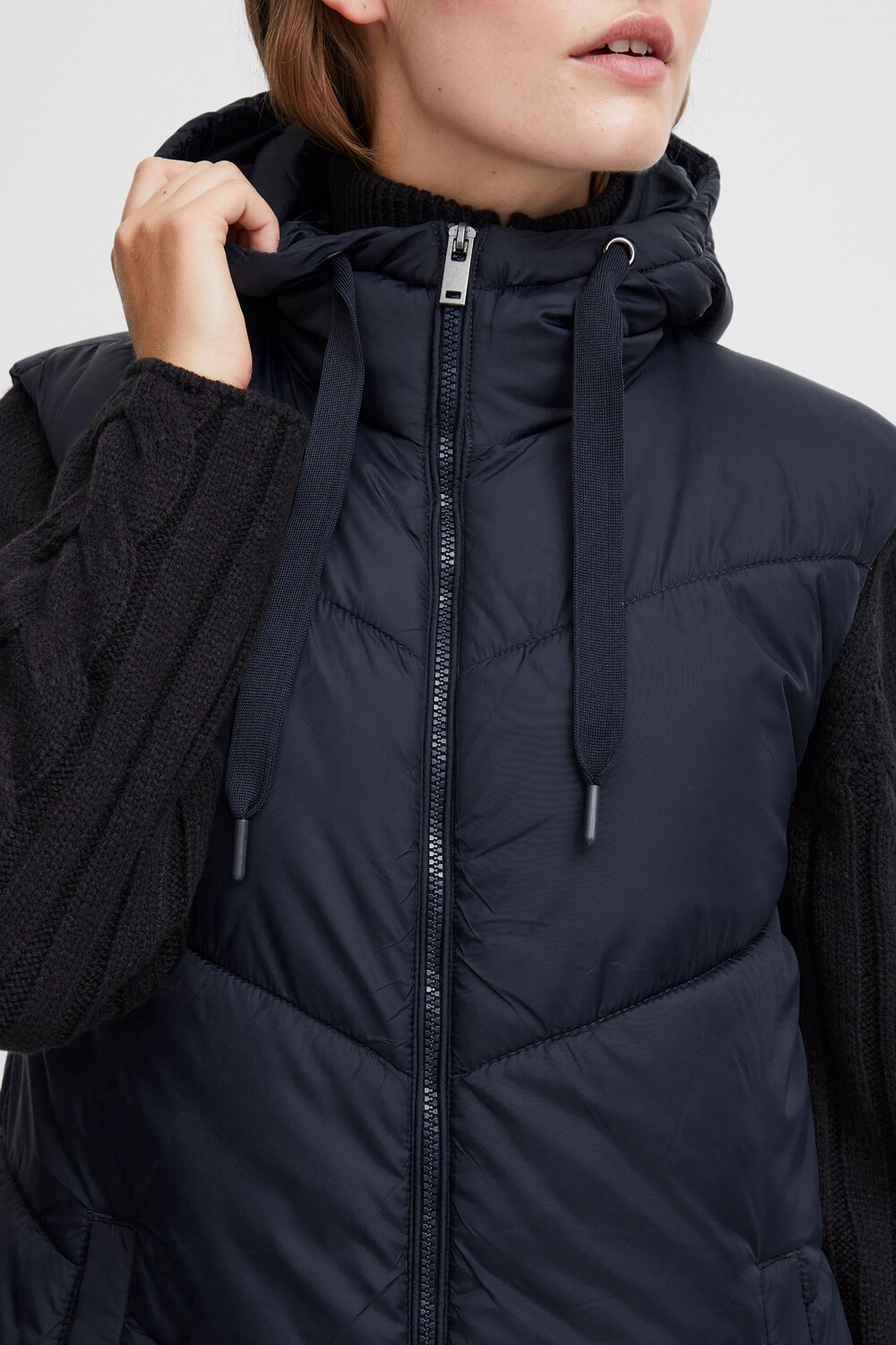 ДЕТАЛИ И ОСОБЕННОСТИ: Жилет, стандартный крой, застежка на пластиковую молнию, два боковых кармана, прочный и высококачественный материал, двусторонняя молния, флисовая подкладка в карманах, эластичный низ и манжеты в проймах на резинке, теплая подкладка, капюшон с кулиска, плоские хлопковые шнуры, прямой край