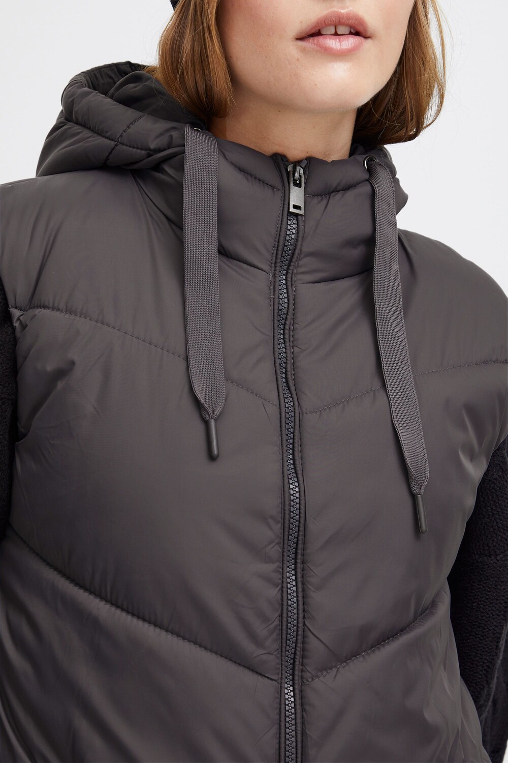 ДЕТАЛИ И ОСОБЕННОСТИ: Жилет, стандартный крой, застежка на пластиковую молнию, два боковых кармана, прочный и высококачественный материал, двусторонняя молния, флисовая подкладка в карманах, эластичный низ и манжеты в проймах на резинке, теплая подкладка, капюшон с кулиска, плоские хлопковые шнуры, прямой край