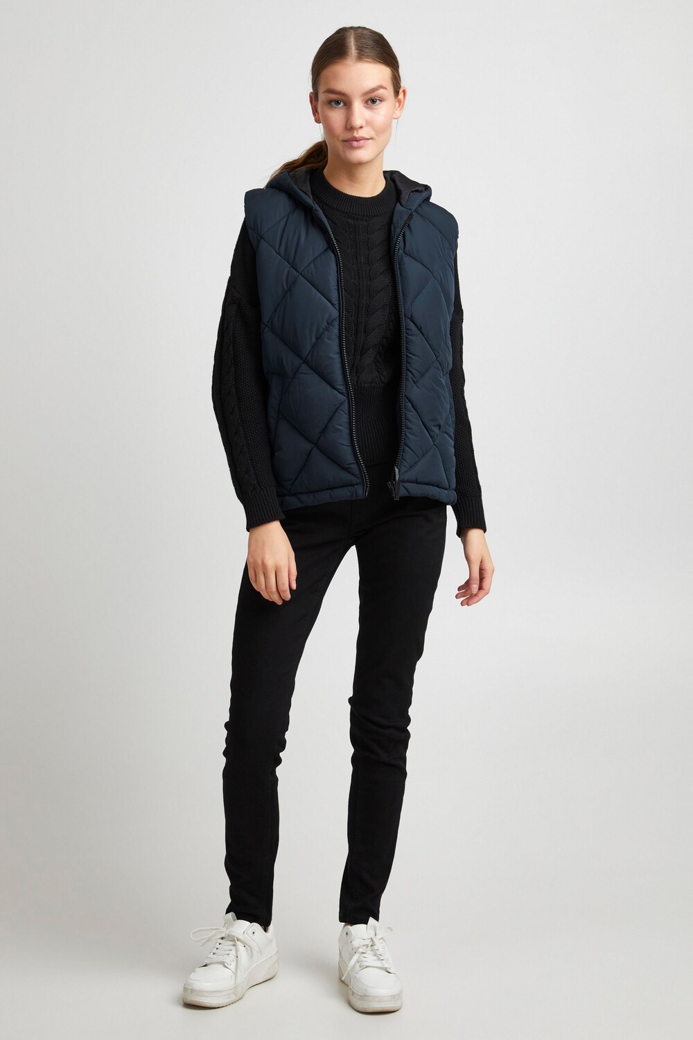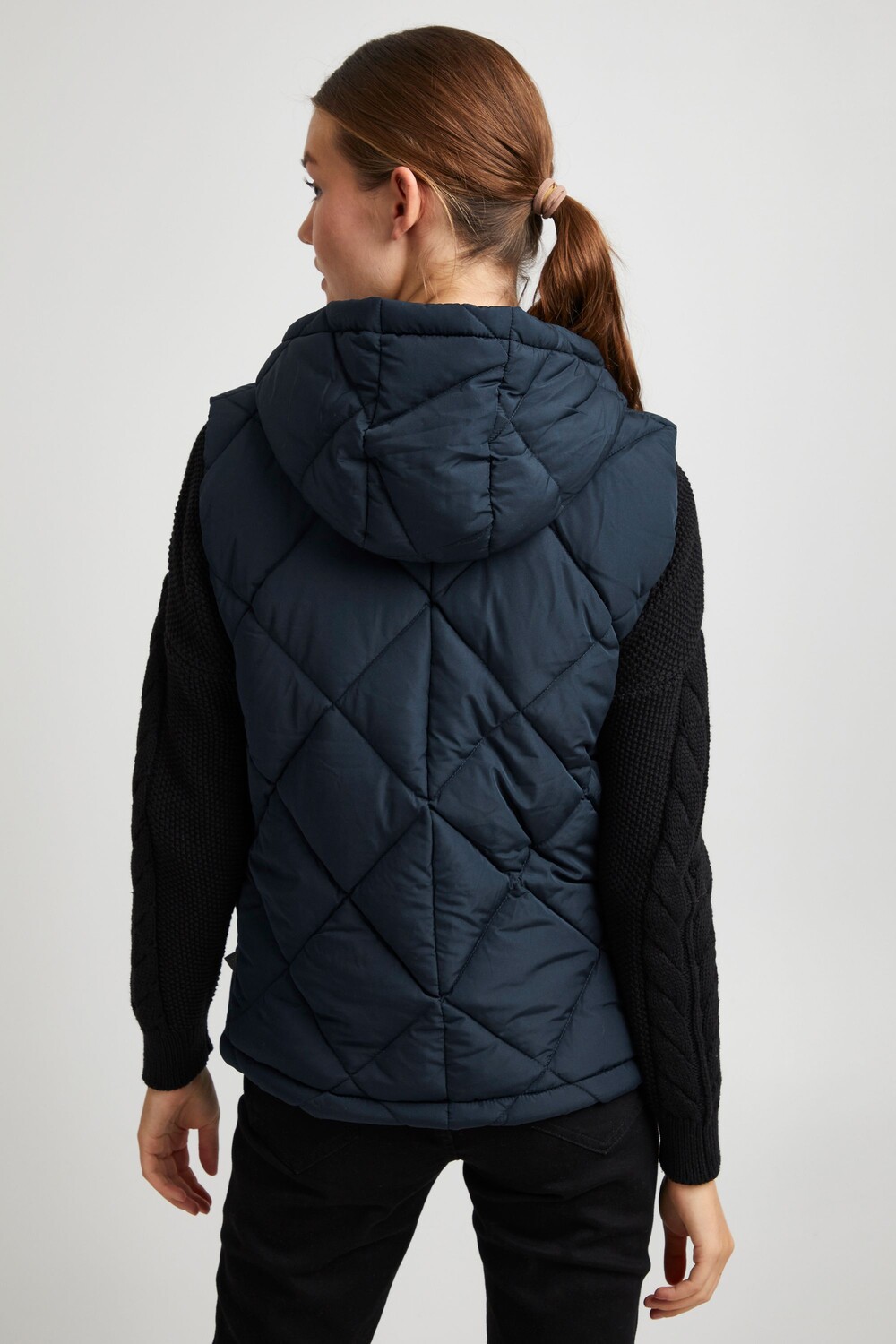 ДЕТАЛИ И ОСОБЕННОСТИ: Современный женский стеганый жилет с капюшоном; мягкий; алмазная вышивка; два боковых кармана на кнопках; черные детали из искусственной кожи (подвеска-пуллер на молнии + значок из искусственной кожи на боковом шве); черная контрастная подкладка и черная молния; мягкий, приятный, слегка переливающийся материал; стандартная посадка