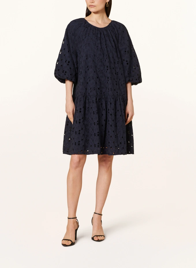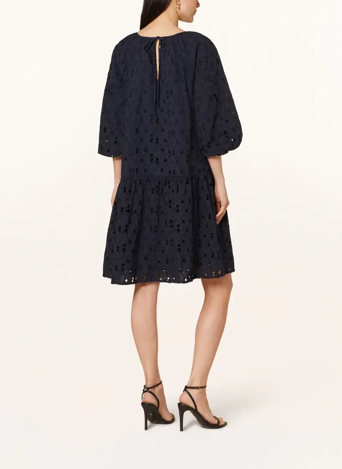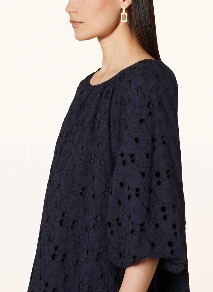 Прямого покроя. Круглый вырез. Короткие рукава. Каплевидный вырез с завязкой сзади. Обработка на подкладке. Кружево по всей поверхности. Чистый хлопок