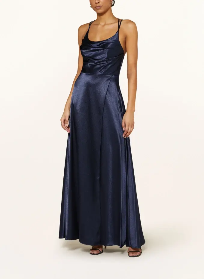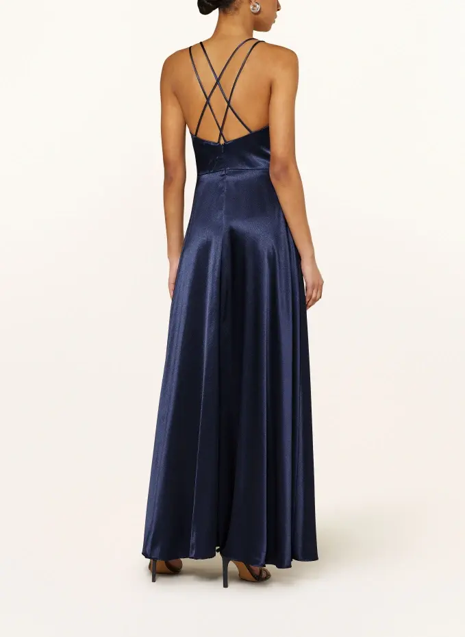 Индивидуальный крой с расклешенной юбкой. Вырез «водопад». Двойные бретельки-спагетти, перекрещенные сзади. Застегивается на тонкую молнию по центру спинки. Обработка на подкладке. Интегрированные чашки сверху. Потайной разрез посередине переда. Качественный блестящий сатин. Свободная обработка