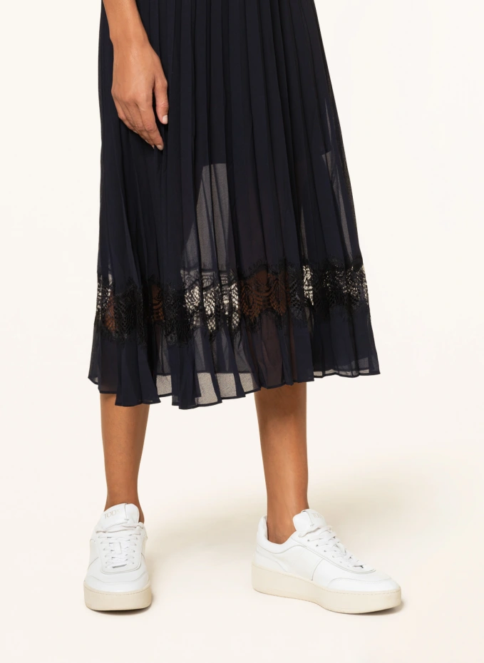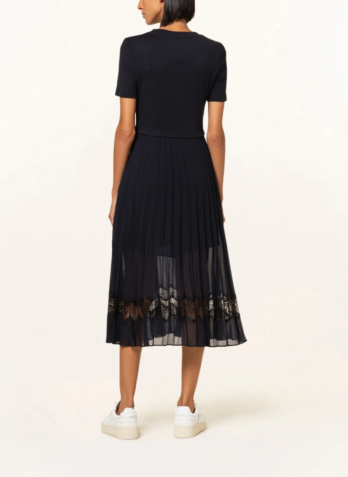 Слегка приталенный крой с расклешенной плиссированной юбкой. Круглый вырез. Лучшее качество пота. Короткие рукава. Застегивается на тонкую молнию сбоку. Частичная обработка с подкладкой. Юбка из крепа. Кружевная вставка по краю юбки