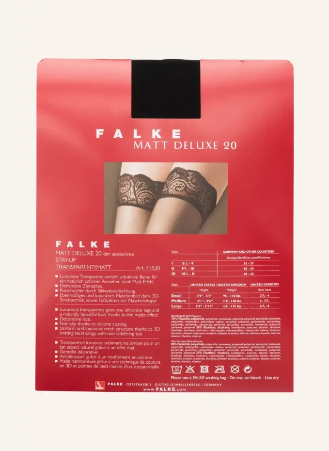 Чулки-Держатели MATT DELUXE от FALKE. Детали: Узкое женственное декоративное кружево. Не скользит благодаря силиконовому покрытию. Пальцы с ограничителем стежка. 20 ден.