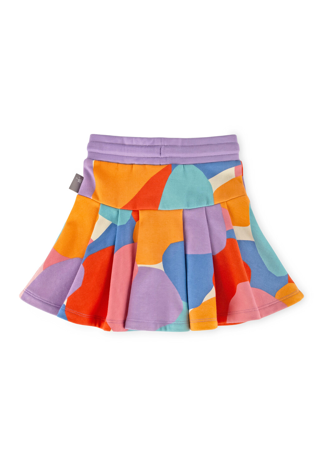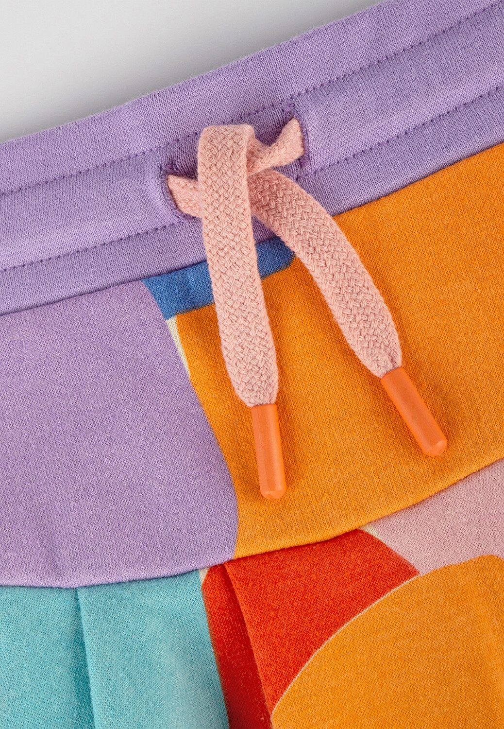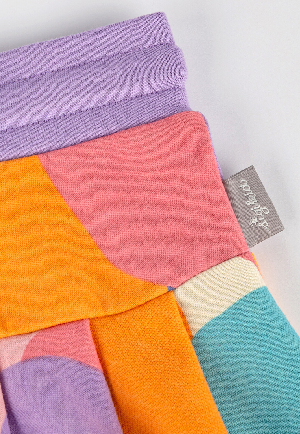 Весенняя яркая спортивная юбка, детская коллекция sigikid Wild Flamingo Весна/Лето 2024. Хлопок из сертифицированного органического земледелия. Качество: спортивная ткань около 300 г/м², грубая изнанка. Разноцветный принт фиолетового/абрикосового/оранжевого/синего/бирюзового цвета. Эластичный широкий пояс с плетеной завязкой. юбка на кокетке в плиссеВсе ткани нашей детской юбки сертифицированы на лейбл Textiles Trust Oeko-Tex® Standard 100 без предупреждения