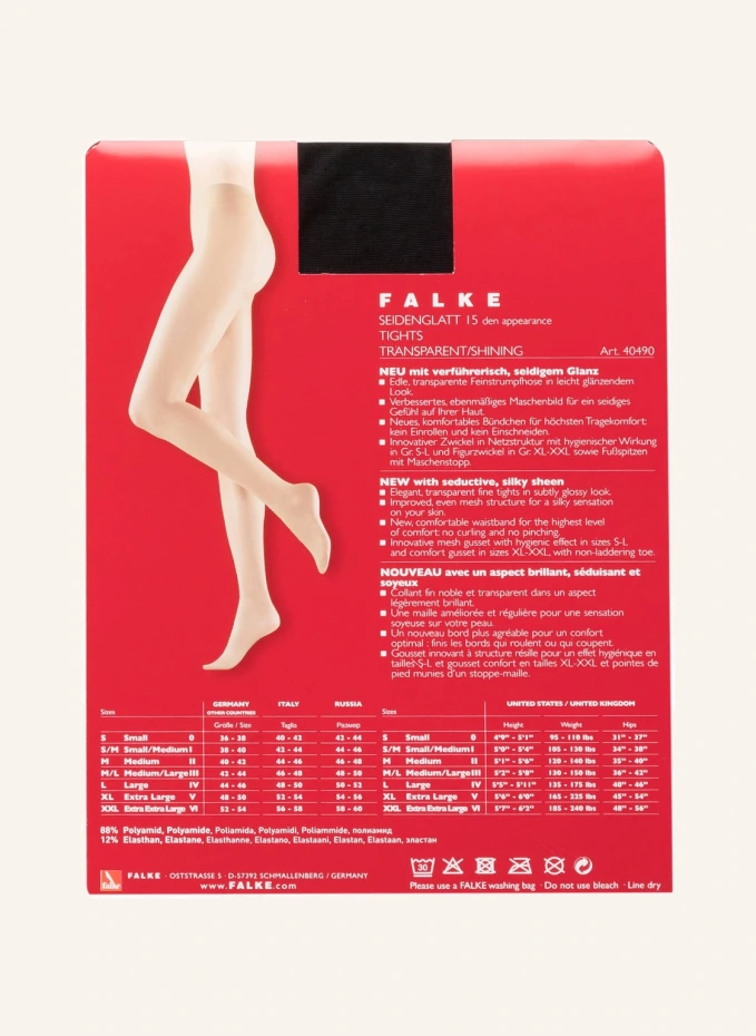Комфортные колготки SEIDENGLATT 15 от FALKE. Детали: Слегка блестящий вид. Качественная стирка с плоским швом. Новый комфортный пояс. Отделение для брюк с системой контроля влажности. Пальцы с ограничителем стежка. Шелковистое ощущение. 15 ден.