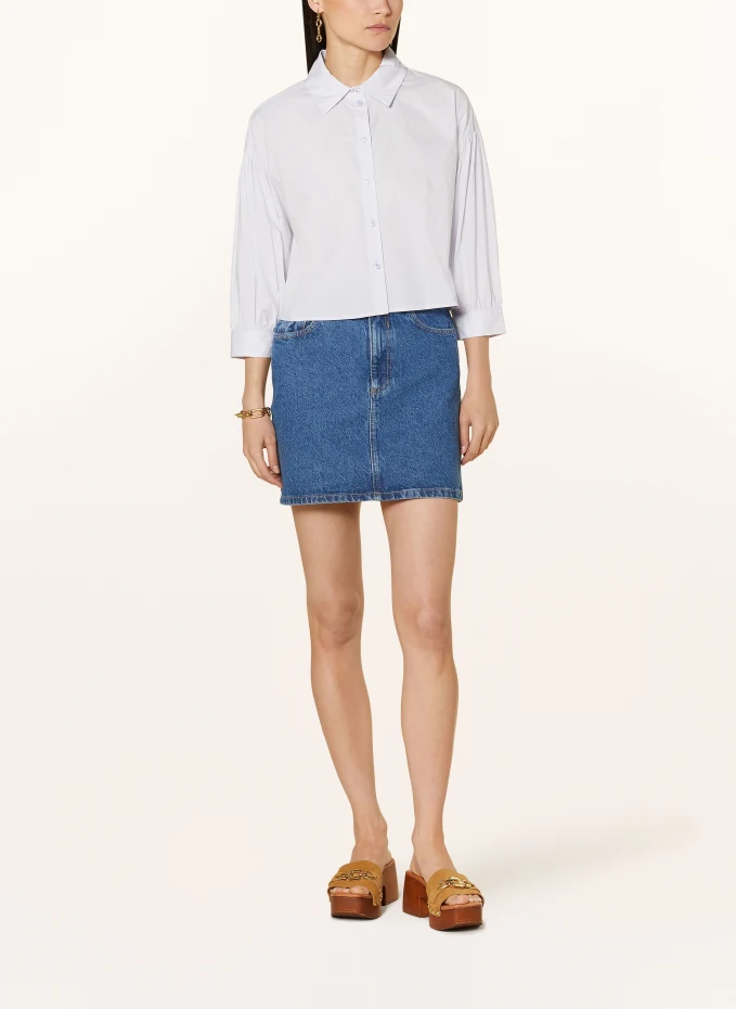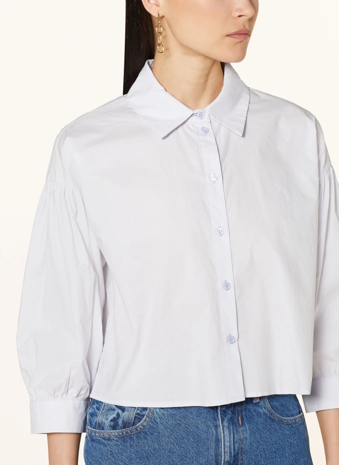 Прямого покроя. Воротник рубашки. Закрывается на прикреплённую планку с пуговицами. Перерез плеч. Рукава-воздушные шары. Гладкое ощущение. Чистый хлопок