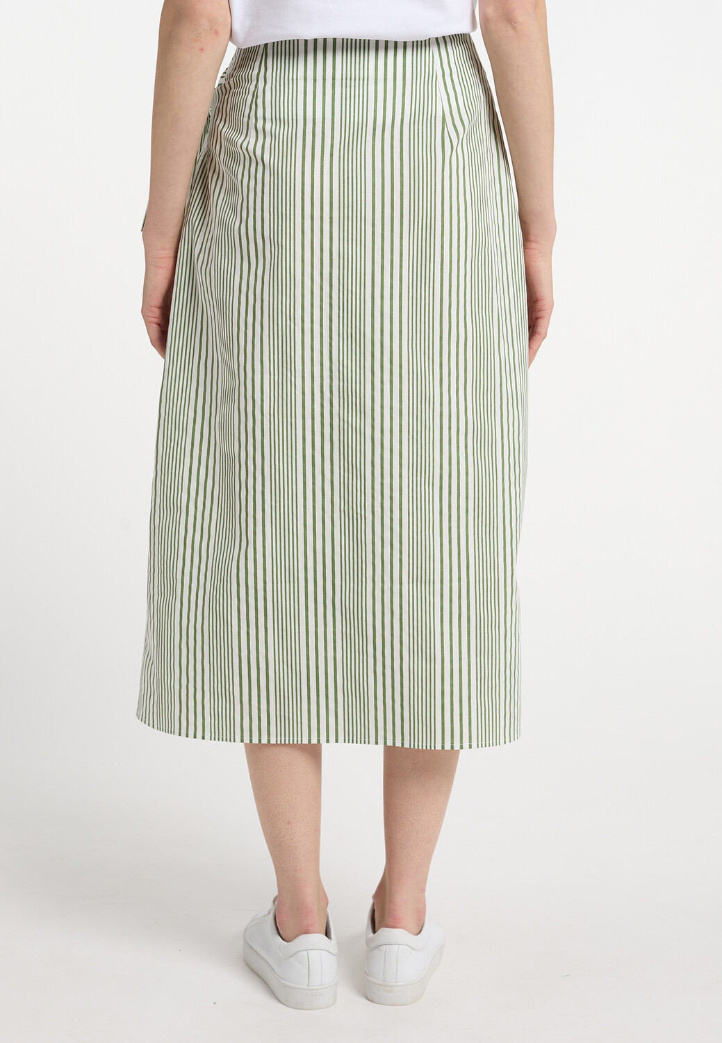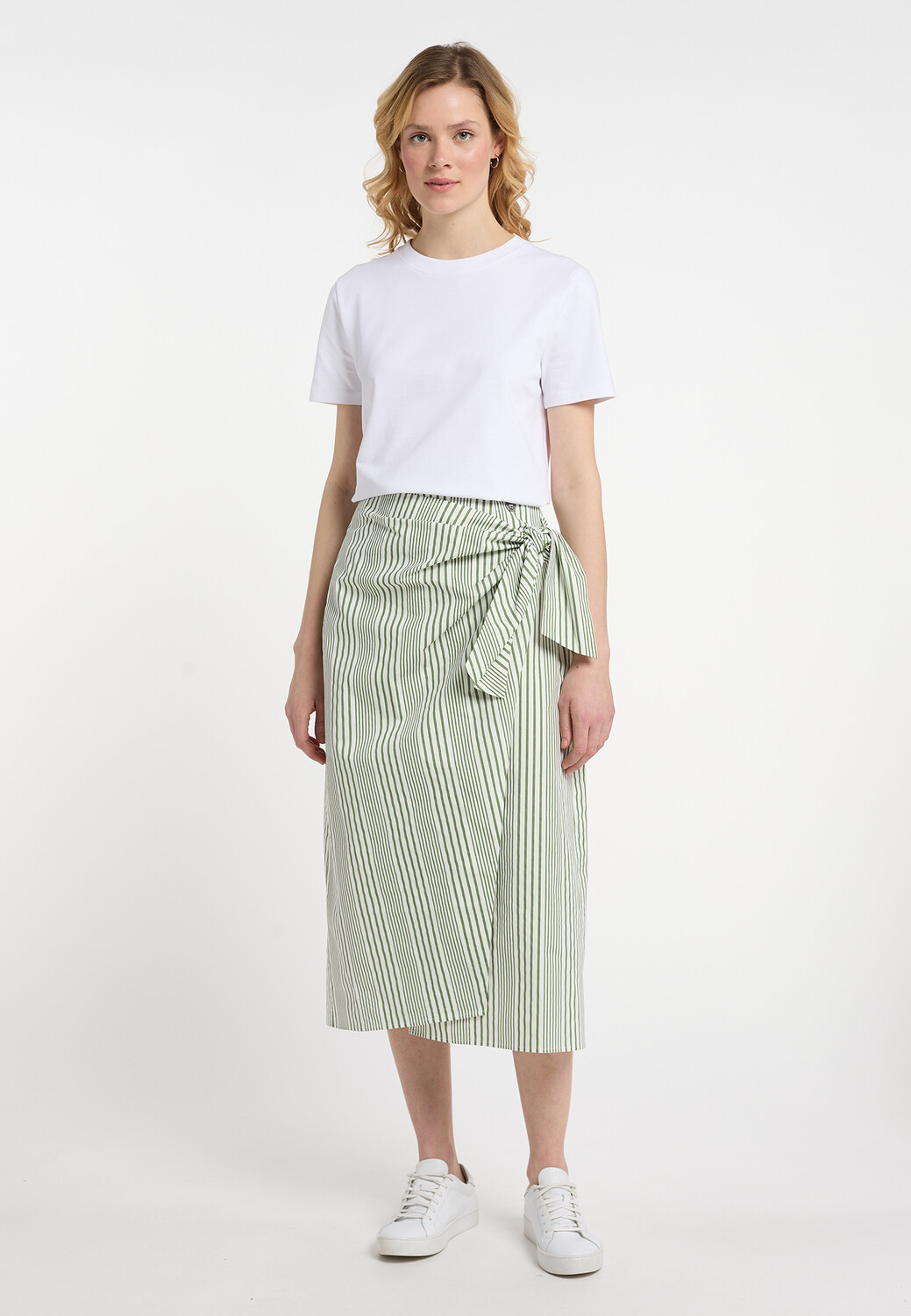 Морская полоска, изысканный асимметричный силуэт с бантом на талии и мягкий хлопковый материал делают эту юбку длиной до икры с запахом от DreiMaster Maritim идеальной летней юбкой. В сочетании с футболкой, сандалиями или кроссовками мы можем мысленно посидеть под зонтиками или прогуляться по пляжной набережной.