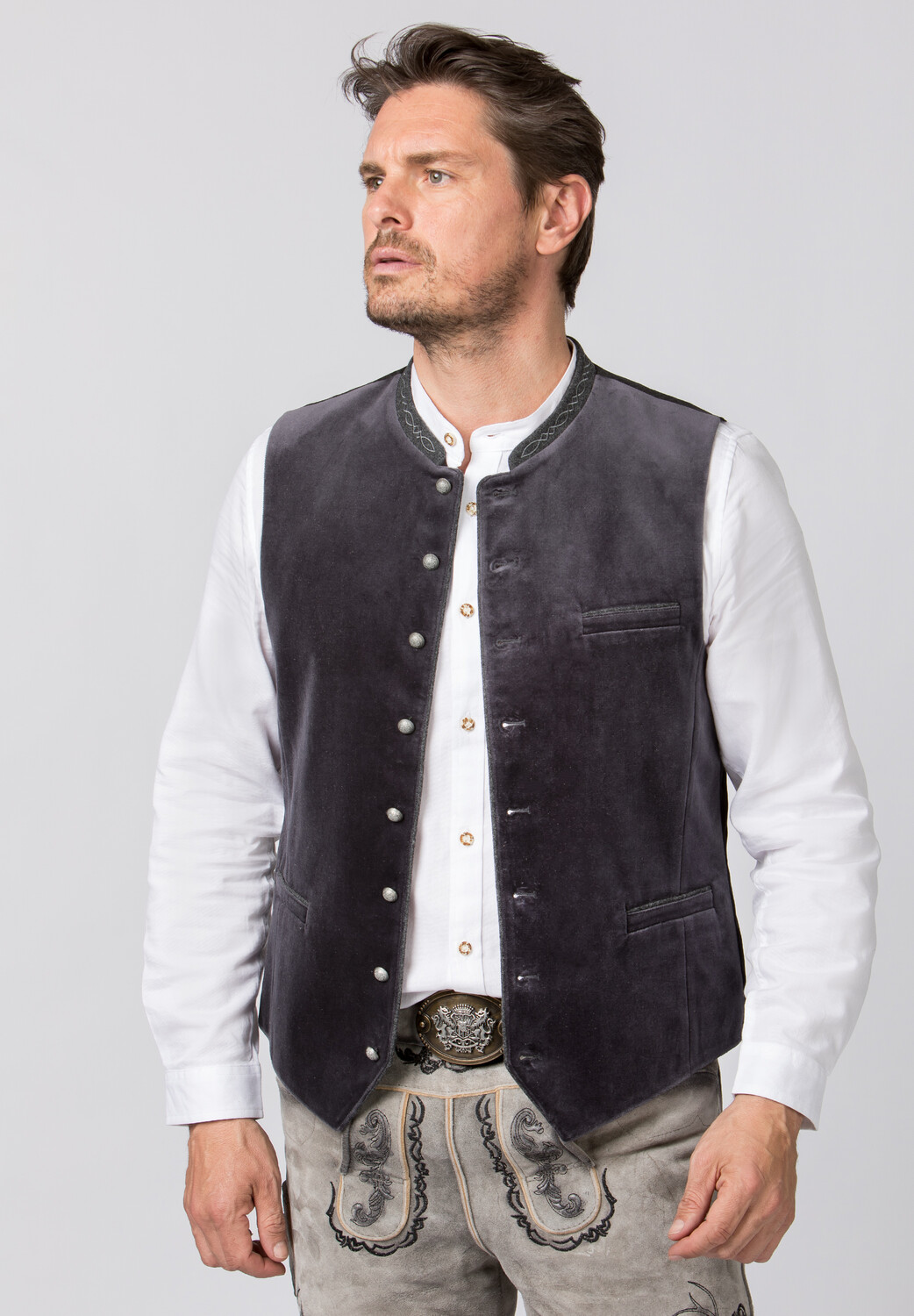 Традиционный жилет Лоренцо от Stockerpoint Classics. Классический жилет из высококачественного хлопкового бархата – это классика среди традиционных жилетов. Воротник-стойка выполнен из высококачественной ткани лоден с тонкой вышивкой и характеризует неповторимый стиль. Цветная окантовка подчеркивает традиционный дизайн. Классический прямой крой гарантирует очень хорошую и удобную посадку. Спинка выполнена из эксклюзивного жаккардового полотна в черную полоску и регулируется с помощью планки. Рельефные пуговицы-шарики из состаренного серебра искусно дополняют элегантный внешний вид. Традиционный жилет — идеальное сочетание с нашими традиционными рубашками и ледерхозенами. Все новое и в то же время кусочек дома.