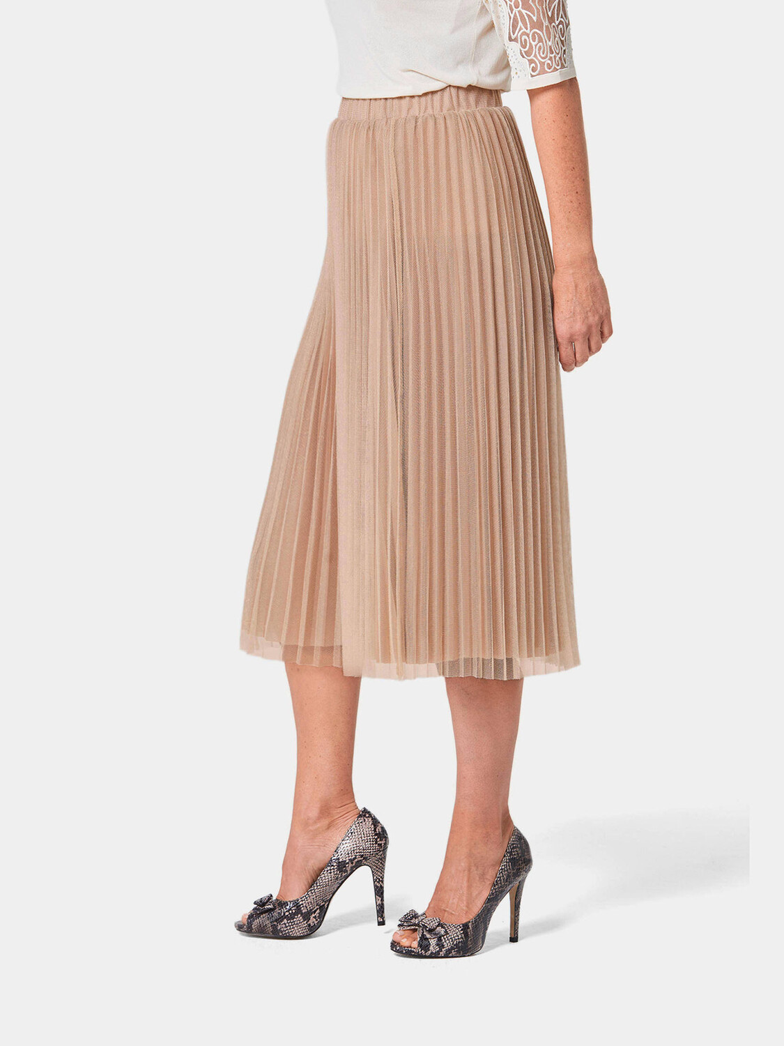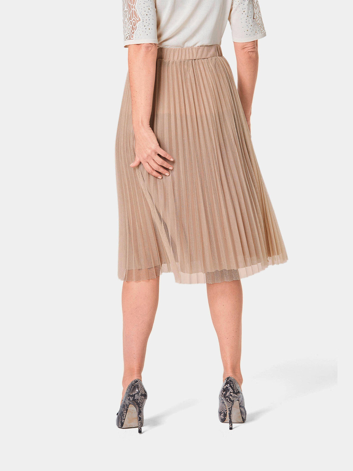 Юбка-плиссе в очаровательной интерпретации: легкая, тонкая сетчатая ткань, переплетенная по всему периметру нитями золотого цвета, придает модели элегантное, ультра-нежное сияние. Чтобы ничего не просвечивало, привлекательная комбинированная звезда покрыта непрозрачной подкладкой. Удобный эластичный пояс по всему периметру мягко повторяет ваши контуры и дарит вам максимум комфорта.