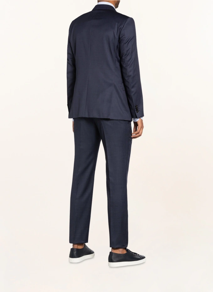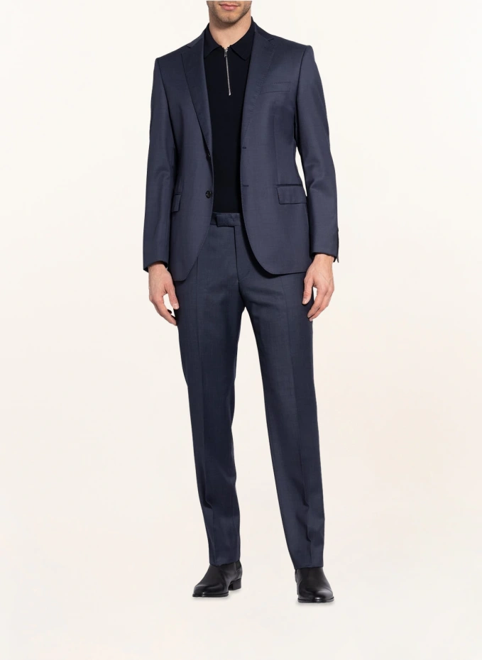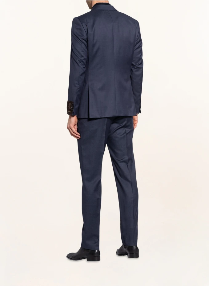 Тонкая посадка. Лацканы с надрезом и петлей. Подворотник и воротник с фетровой отделкой. Наплечники. Шов АМФ. Однобортное с двумя пуговицами. Прорезной карман на уровне груди. Поцелуйные пуговицы на концах рукавов. Карманы с клапанами на окантовке. Два боковых разреза. Внутренние карманы. Обработка на подкладке. Структурированное ощущение