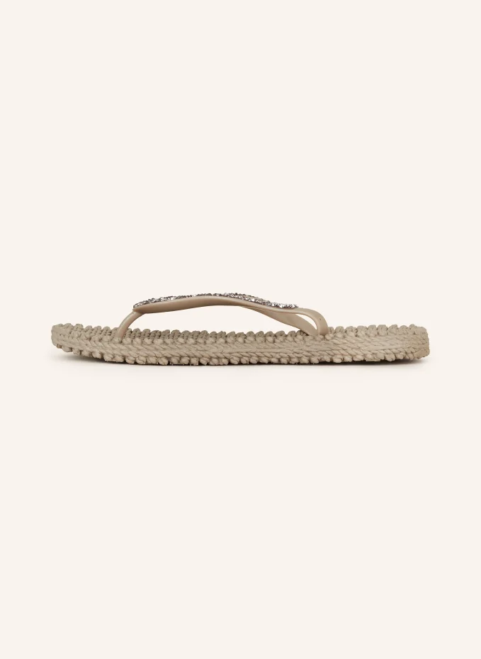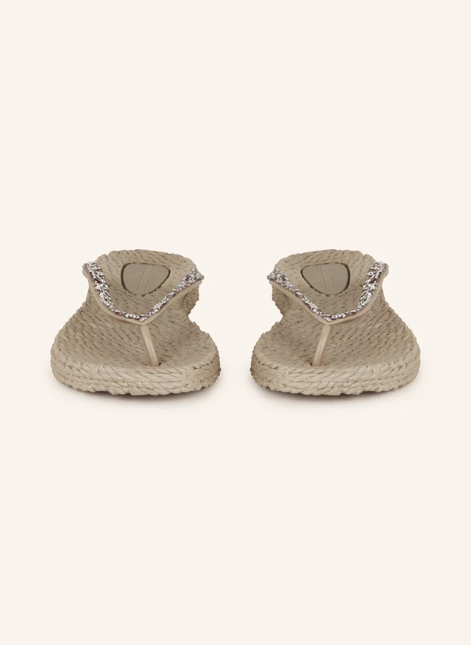 Синтетика с плетеным эффектом. Отделка драгоценными камнями. Столб для ног. Узкие бретели через подъем. Текстурированная подошва. Нескользящая подошва