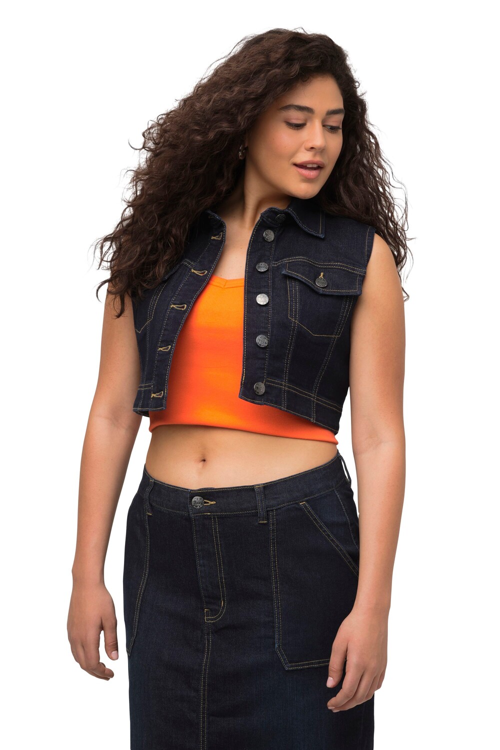 Джинсовый жилет укороченного кроя, выполненный из модного денима, выстиранного в полоскании, выглядит стильно. Из переработанного полиэстера. Воротник рубашки, планка на пуговицах, 2 нагрудных кармана. Без рукавов.