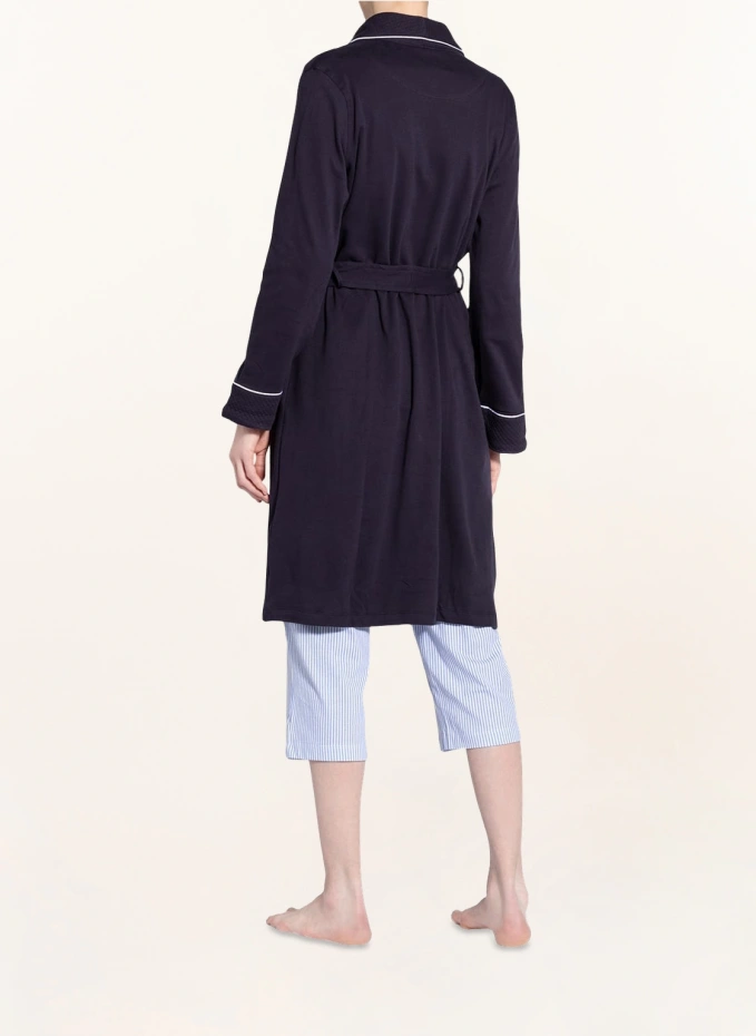 Шалевый воротник. Нашивка с логотипом на груди. Боковые карманы. Контрастная окантовка. Завязывающийся ремень с двойными петлями для различного положения ремня.