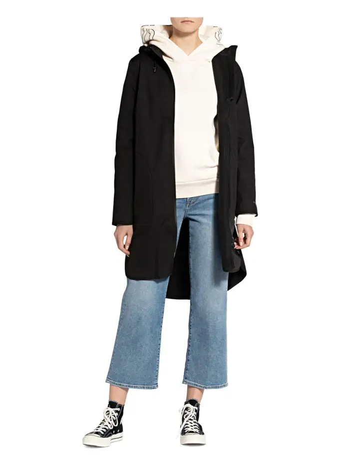 Прямого покроя. PFC бесплатно. Водо- и грязеотталкивающий. Высокий воротник с защитой подбородка. Съемный капюшон, регулируемый резинкой. Застегивается на двустороннюю молнию (водонепроницаемую). Боковые карманы на молнии. Регулируемый по ширине рукав заканчивается кнопками. Обработка на подкладке. Согревающая флисовая подкладка.