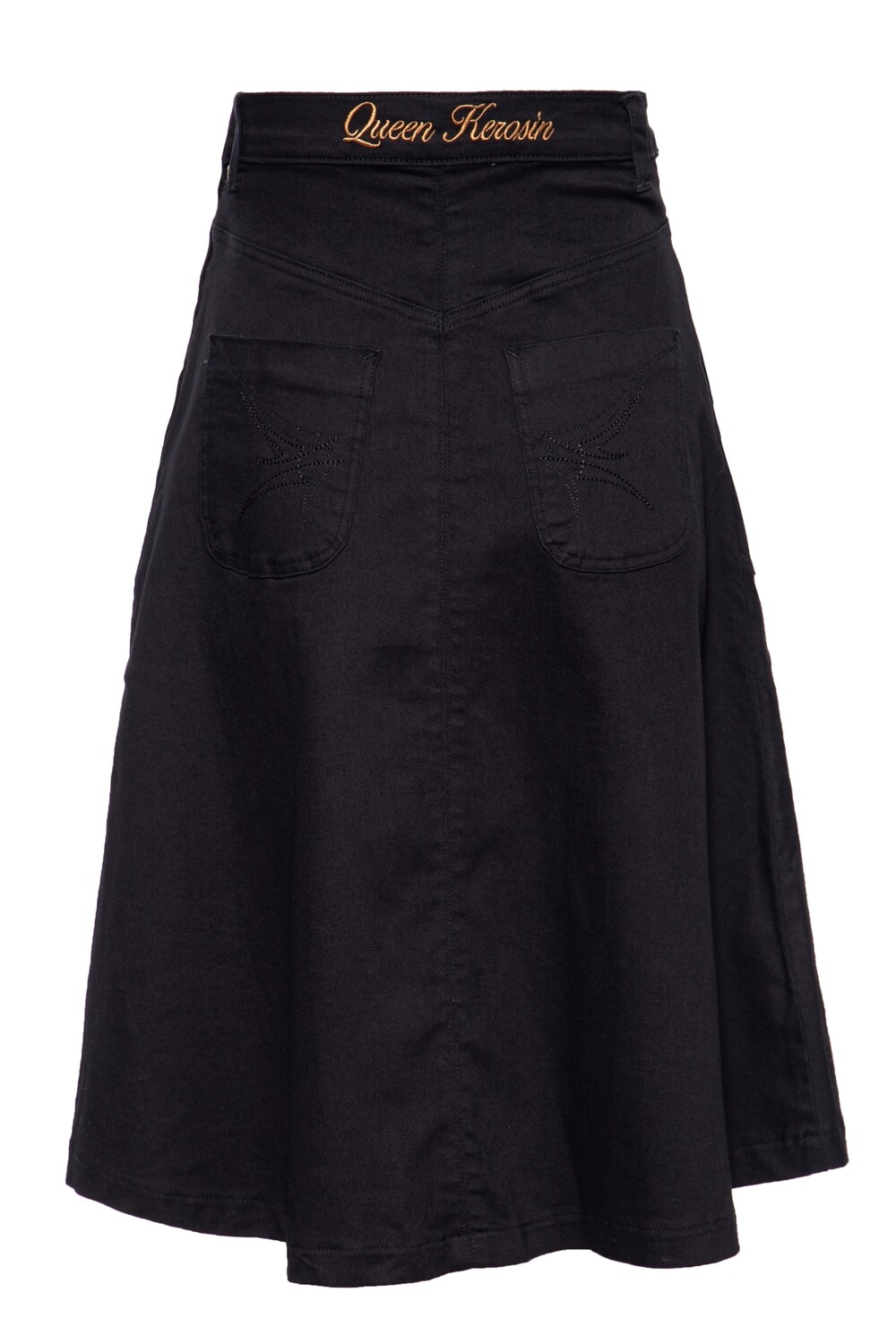 Винтажная распашная юбка Queen Kerosin станет очень женственной! Эластичный джинсовый материал прочен, приятен для кожи, долговечен и не требует особого ухода. Приталенная юбка А-силуэта плотно прилегает к талии и расширяется к низу. Карманы спереди и накладные задние карманы с узором в тонкую полоску создают стильный образ рабочей одежды. Такие детали, как застежка на спине и изящная вышивка, искусно завершают дизайн. Юбка застегивается на молнию в боковом шве. Пояс с вышивкой и наконечниками стрел позволяет индивидуально регулировать посадку на талии с помощью головок. Сочетайте его с узкой рубашкой с длинными рукавами или топом с туфлями, чтобы создать великолепный повседневный образ с культовым винтажным шармом. Наш вариант черного цвета изготовлен из 83 % хлопка, 15 % полиэстера и 2 % эластана. Кроме того, модель не имеет подтяжки сзади, но такая же очаровательная и красивая! Почему бы вам не получить обе модели для большего разнообразия? ;)