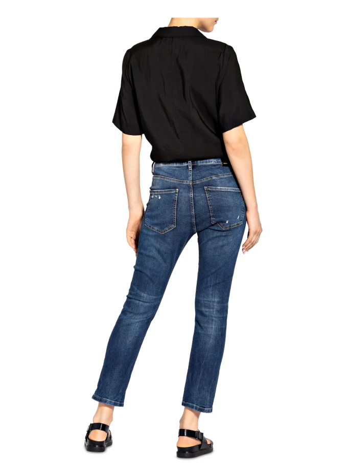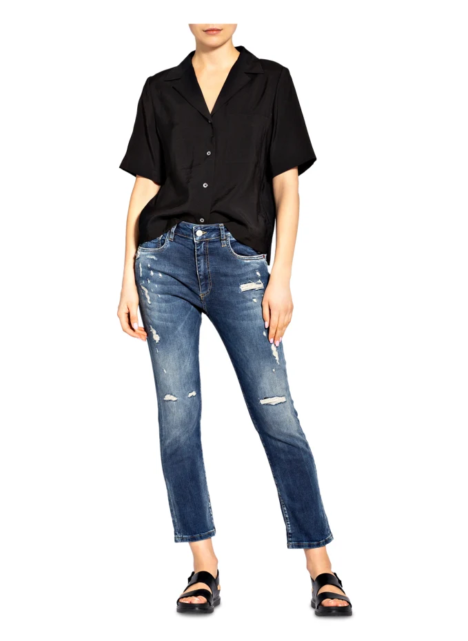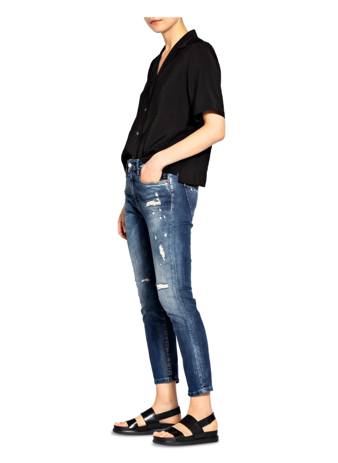 Высокая талия. Зауженная, укороченная ножка. Застежка-молния. 5-карманный стиль. Этикетка на поясе. Разрушенные эффекты