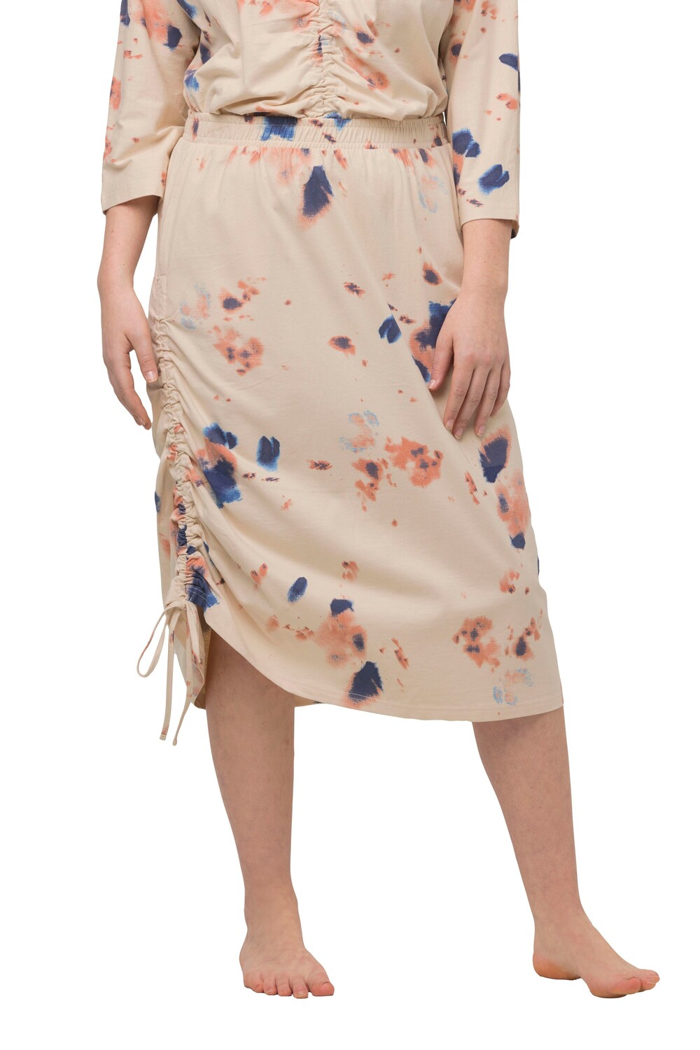 Трикотажная юбка из натурального хлопка. Слегка расклешенная юбка-комбинация с нежным цветным принтом. Боковая полоска по низу для регулировки длины. Эластичный пояс, боковые карманы. Органический; сертифицировано лицензией ECOCERT Greenlife № 152026.