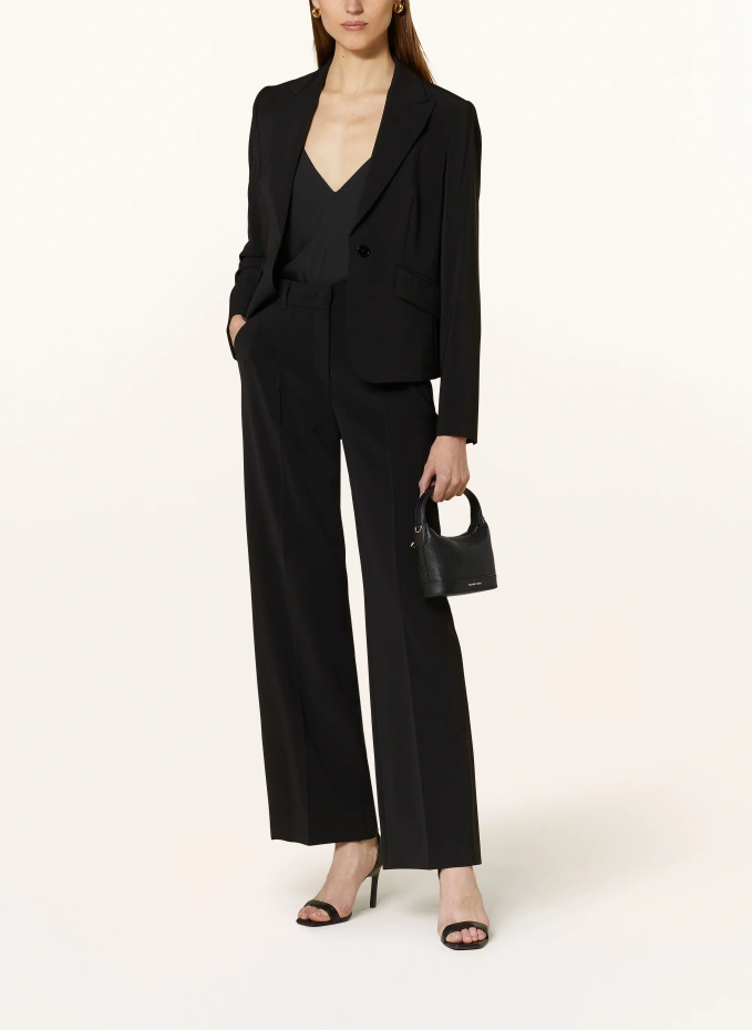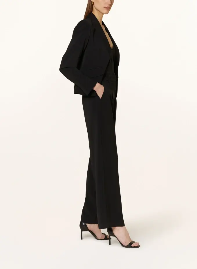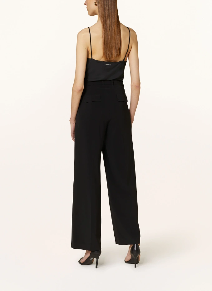 Высокая талия. Прямая, широкая ножка. Застегивается на пуговицу, крючок и молнию. Шлевки. Складки, подчеркивающие фигуру. Боковые карманы. Карманы с клапанами по канту