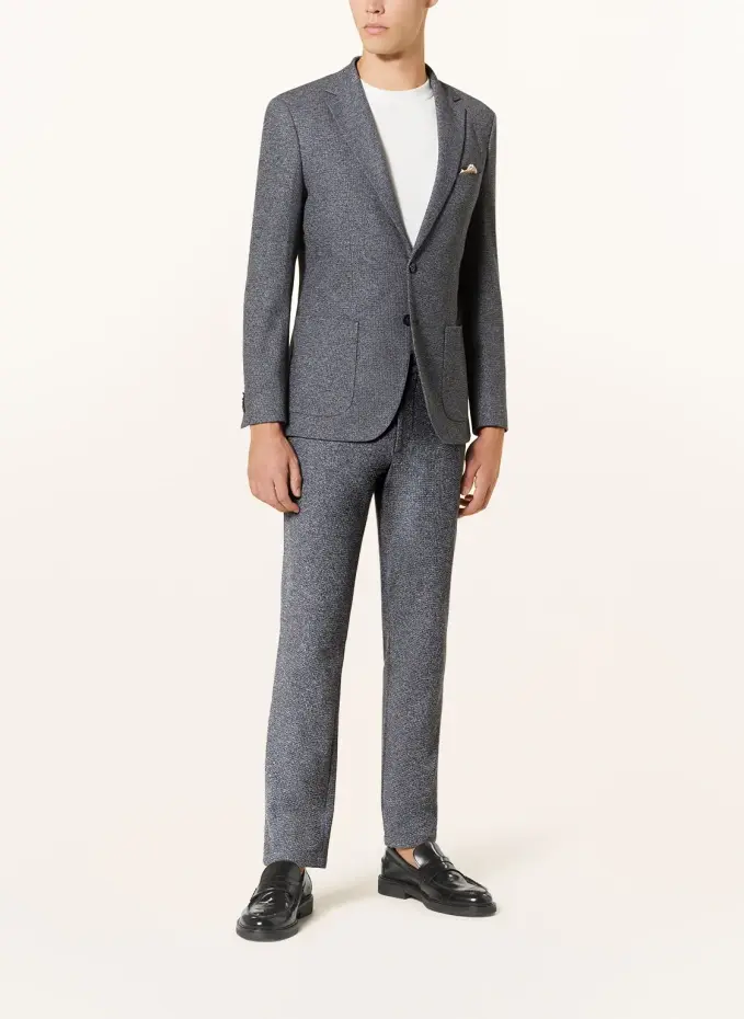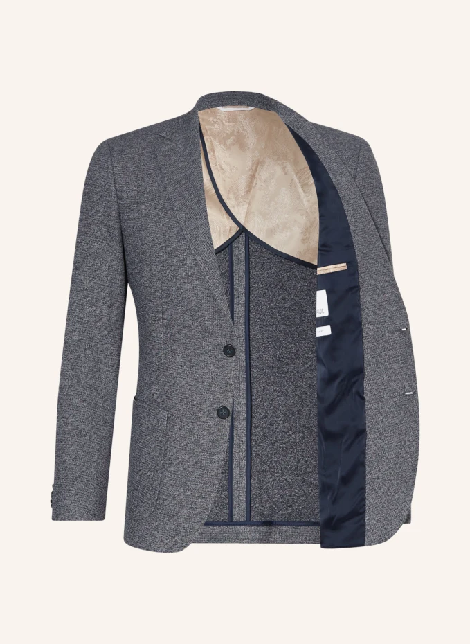 Посадка согласно производителю: Slim Fit. Лацканы с надрезом и петлей. Неброские подплечники. Однобортное с двумя пуговицами. Прорезной карман на уровне груди. Подкладку прорезного кармана можно оформить в виде нагрудного платка. Поцелуйные пуговицы на концах рукавов. Накладные карманы. Внутренние карманы. Два боковых разреза. Гладкая подкладка на рукавах и спине. Прекрасный узор по всей поверхности. Смесь материала с хлопком