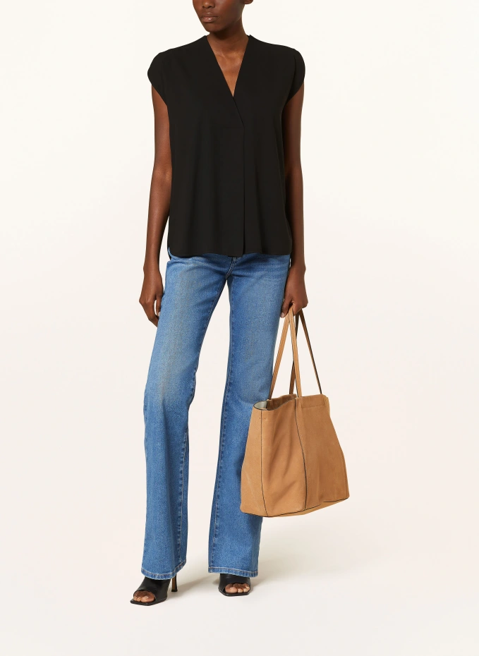 Прямого покроя. V-образный вырез. Слегка удлиненная задняя часть. Короткие разрезы по бокам