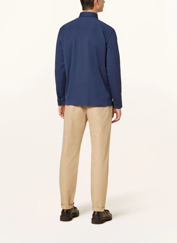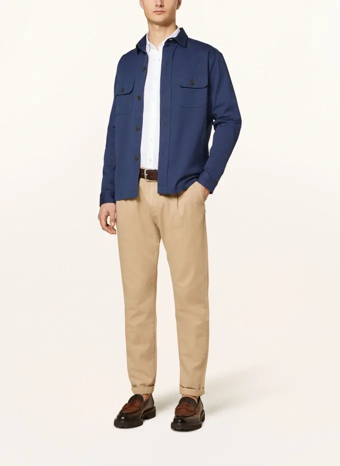 Прямого покроя. Кентский воротник. Широкая кокетка сзади. Нагрудные карманы на пуговицах. Прикрепленная планка с пуговицами. Манжета на одну пуговицу. Без внутренней подкладки. Саржевая структура
