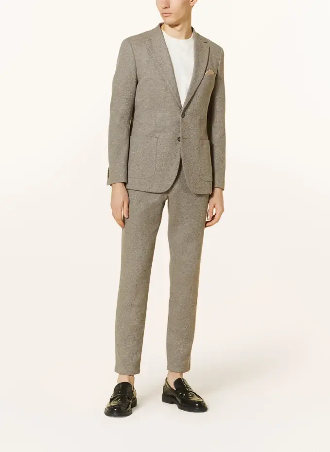 Посадка согласно производителю: Slim Fit. Лацканы с надрезом и петлей. Неброские подплечники. Однобортное с двумя пуговицами. Прорезной карман на уровне груди. Подкладку прорезного кармана можно оформить в виде нагрудного платка. Поцелуйные пуговицы на концах рукавов. Накладные карманы. Внутренние карманы. Два боковых разреза. Гладкая подкладка на рукавах и спине. Прекрасный узор по всей поверхности. Смесь материала с хлопком